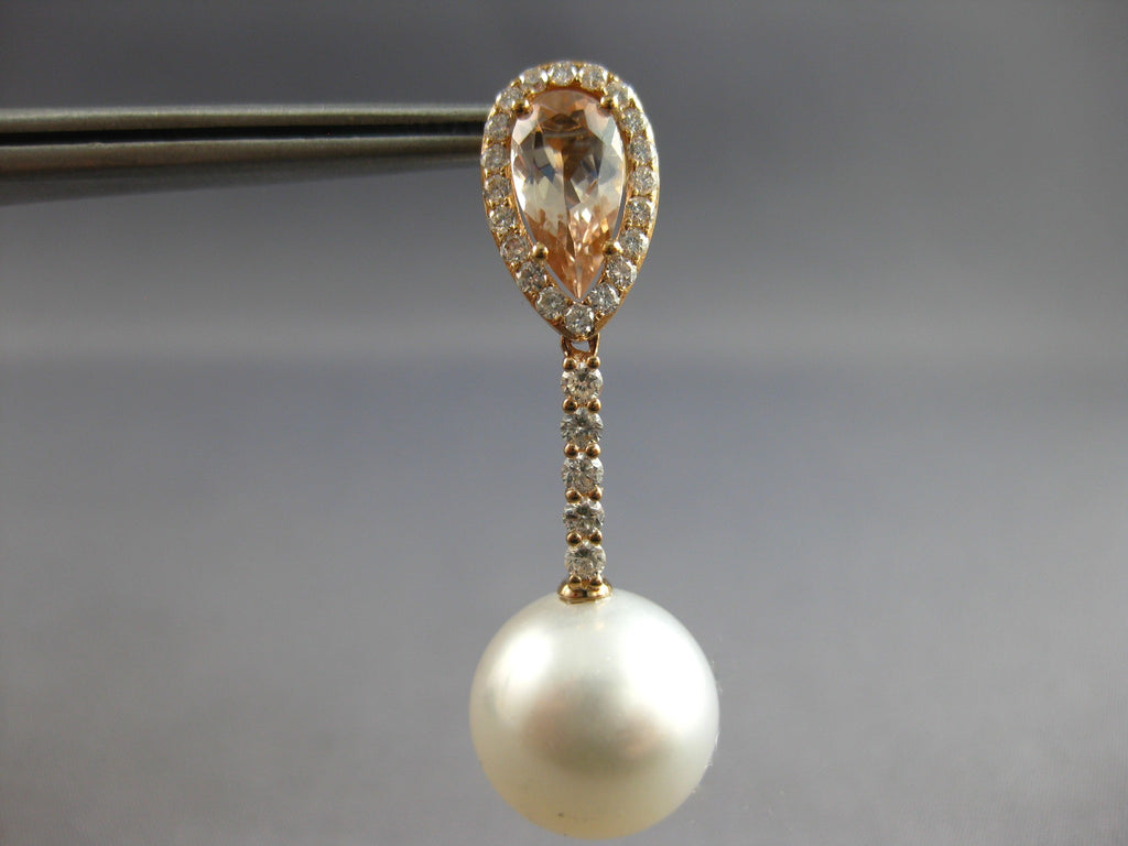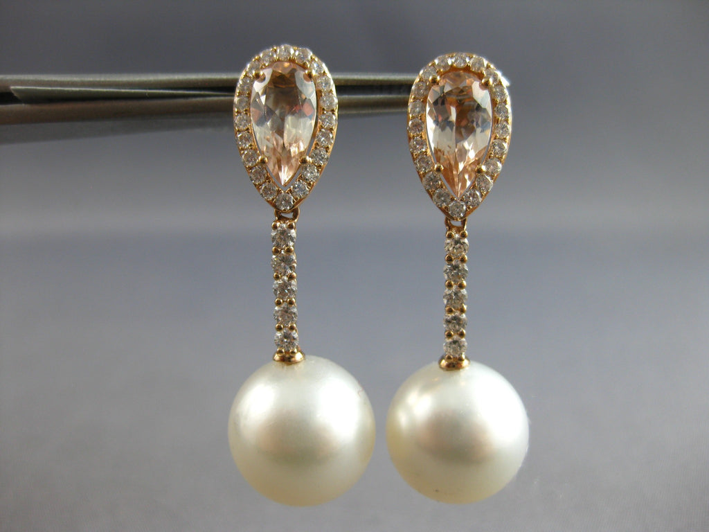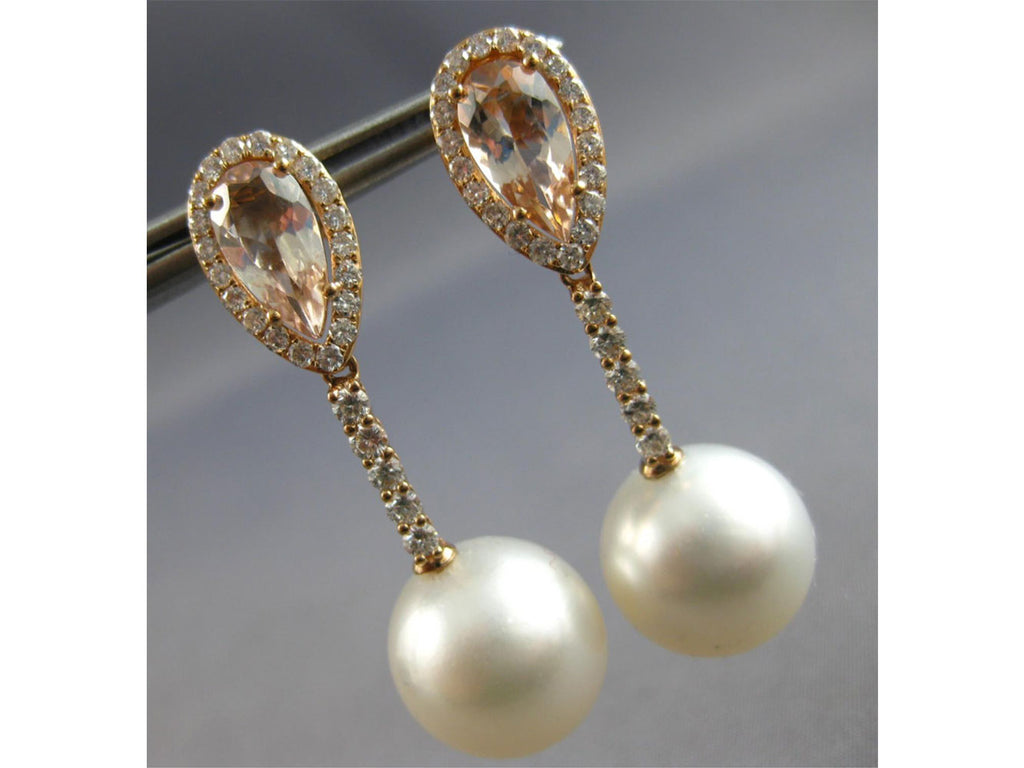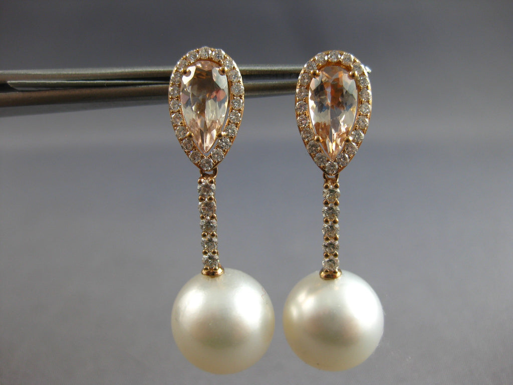 LARGE 18KT ROSEA GOLDA HANGINGA EARRINGS. 3D CLASSIC TEAR DROPA DESIGN. DIAMONDS ARE F/G COLOR, VSSI CLARITY .76 CARATS.A AAA MORGANITES ARE 2.04 CARATS. FEATURESA AAA SOUTH SEA PEARLS. PEARLSA MEASUREA 12mm WIDE.A EARRINGS MEASURE 37mm X 12mm.A WRITTEN APPRAISAL AVAILABLE. COMES IN A PRESENTABLE GIFT BOX.