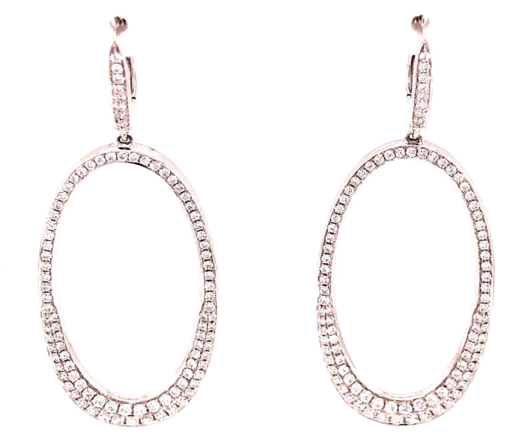ESTATE LARGE 18KT WHITE GOLD HANGING EARRINGS. 3D CLASSIC OPEN OVAL DESIGN. DIAMONDS ARE F/G COLOR, VSSI CLARITY 2.0 CARATS. WRITTEN APPRAISAL AVAILABLE. COMES IN A PRESENTABLE GIFT BOX.