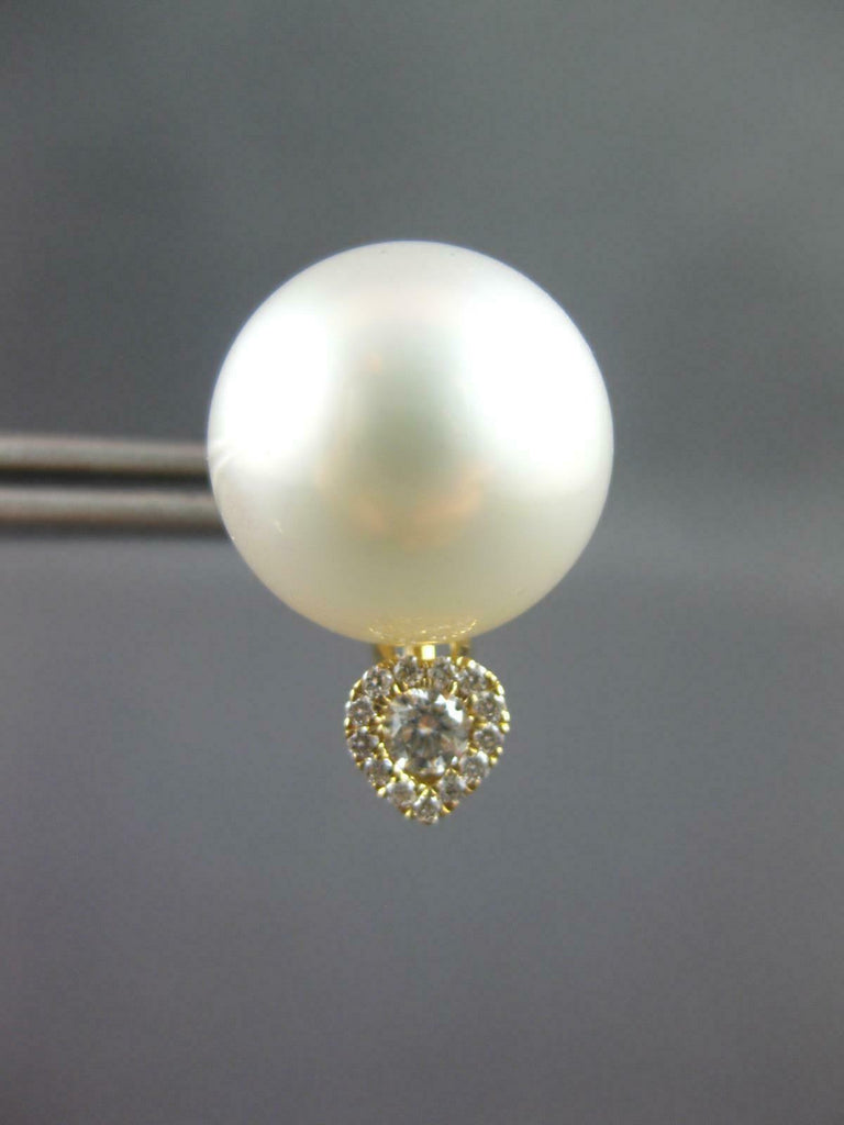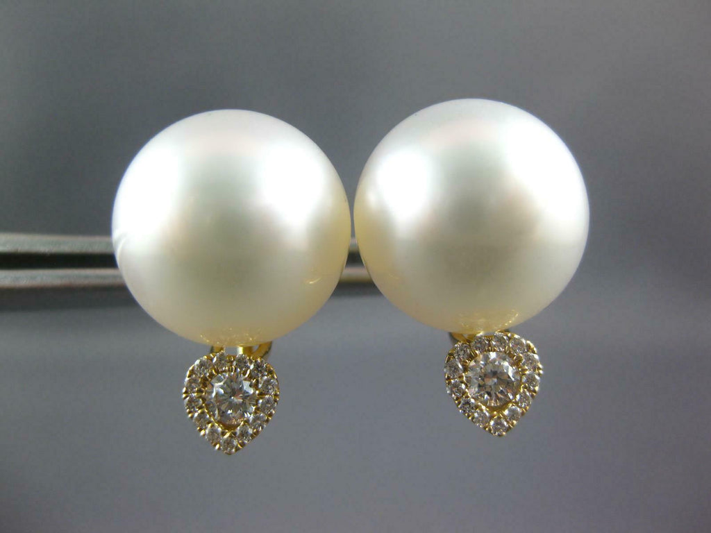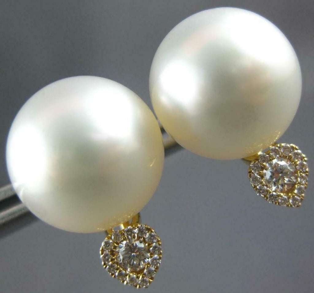 ESTATE LARGE 18KT YELLOW GOLD STUD EARRINGS. 3D CLASSIC TEAR DROP DESIGN. DIAMONDS ARE F/G COLOR, VSSI CLARITY .27 CARATS. FEATURES 13MM WIDE AAA SOUTH SEA PEARLS. EARRINGS MEASURE 13MM X 18.5MM. WRITTEN APPRAISAL AVAILABLE. COMES IN A PRESENTABLE GIFT BOX.
