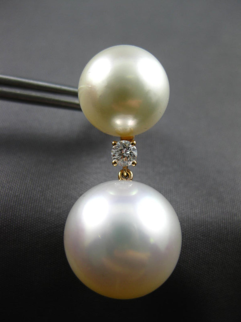 ESTATE LARGE 18KT ROSE GOLD HANGING EARRINGS. 3D CLASSIC DESIGN. DIAMONDS ARE F/G COLOR, VSSI CLARITY .28 CARATS. FEATURES 14mm WIDE AAA SOUTH SEA PEARL. EARRINGS MEASURES 30mm X 14mm. WRITTEN APPRAISAL AVAILABLE. COMES IN A PRESENTABLE GIFT BOX.