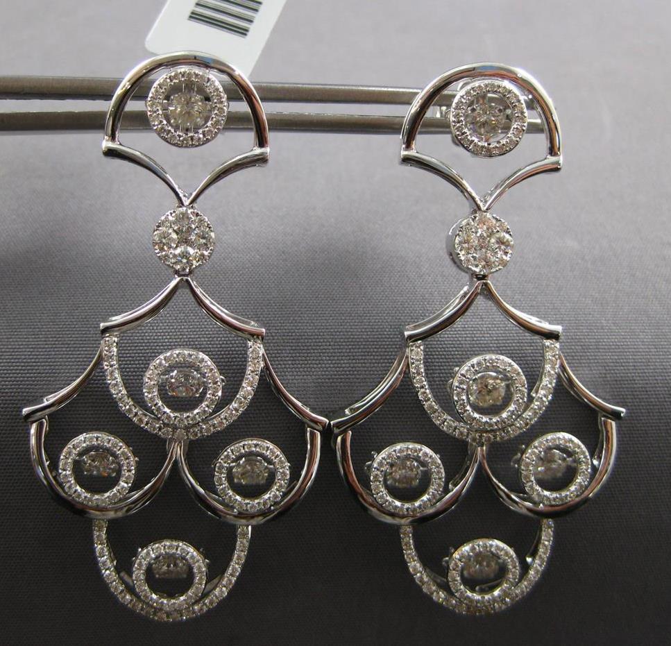 ESTATE LARGE 14KT WHITE GOLD FUN HANGING EARRINGS. 3D CLASSIC DESIGN. DANCING DIAMONDS ARE F/G COLOR, VSSI CLARITY 2.97 CARATS. MEASURES 51mm X 26mm. WRITTEN APPRAISAL AVAILABLE. COMES IN A PRESENTABLE GIFT BOX.