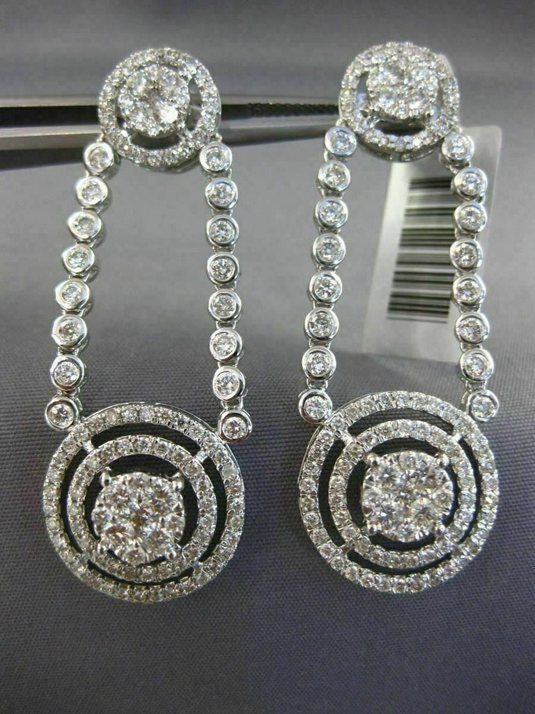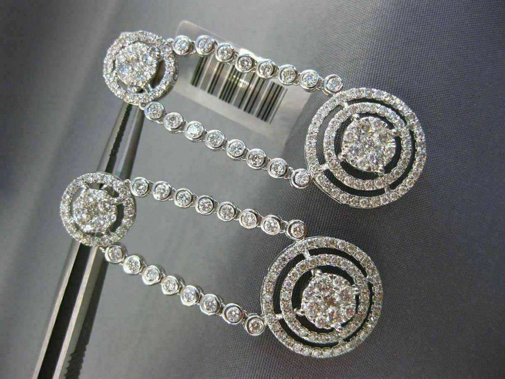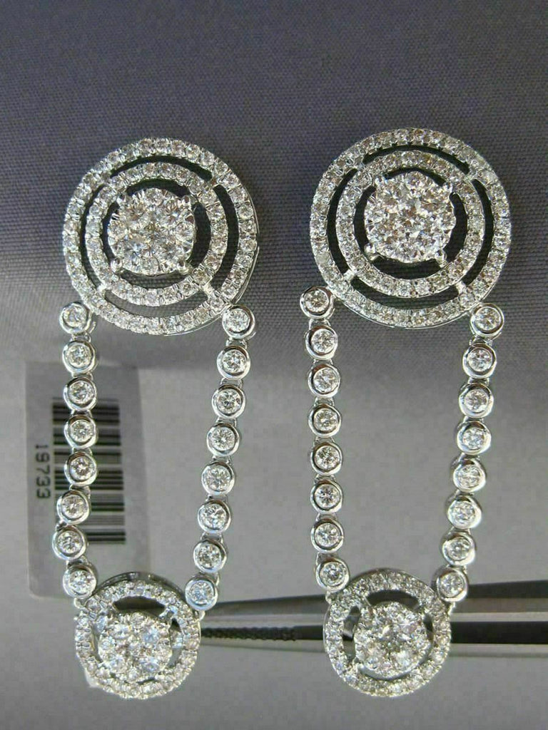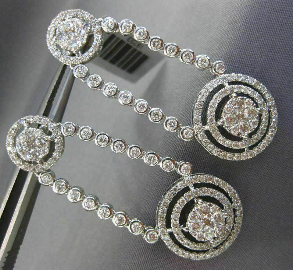 ESTATE LARGE 14KT WHITE GOLD HANGING EARRINGS. 3D CIRCULAR CLUSTER DOUBLE HALO DESIGN. DIAMONDS ARE F/G COLOR, VSSI CLARITY 3.20 CARATS. MEASURES 44mm X 16mm WIDE. WRITTEN APPRAISAL AVAILABLE. COMES IN A PRESENTABLE GIFT BOX