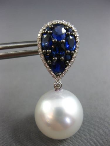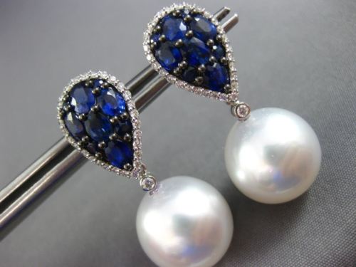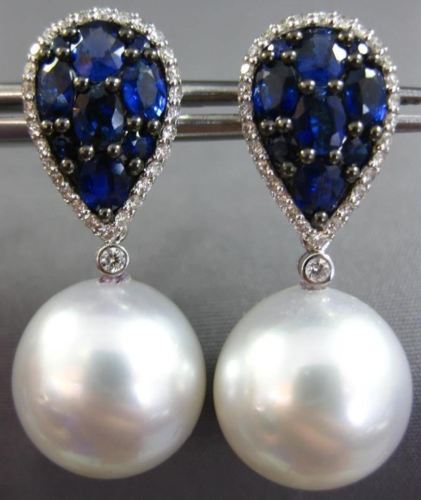ESTATE LARGE 18KT WHITE GOLD HANGING EARRINGS. 3D PEAR SHAPE CLUSTER DESIGN. DIAMONDS ARE F/G COLOR VSSI CLARITY .40 CARATS. AAA SAPPHIRES ARE 2.98 CARATS. FEATURES AAA SOUTH SEA PEARLS 13mm WIDE. MEASURES 30mm X 10mm. WRITTEN APPRAISAL AVAILABLE. COMES IN A PRESENTABLE GIFT BOX.