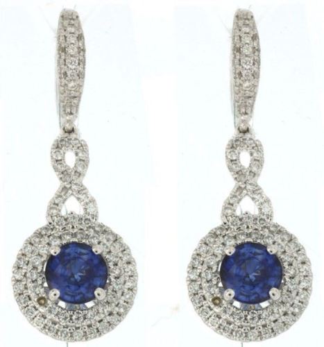 ESTATE LARGE 14KT WHITE GOLD HANGING EARRINGS. 3D DOUBLE HALO INFINITY DESIGN. DIAMONDS ARE F/G COLOR, VSSI CLARITY 1.05 CARATS. TREATED SAPPHIRES ARE 2.60 CARATS. WRITTEN APPRAISAL AVAILABLE. COMES IN A PRESENTABLE GIFT BOX.