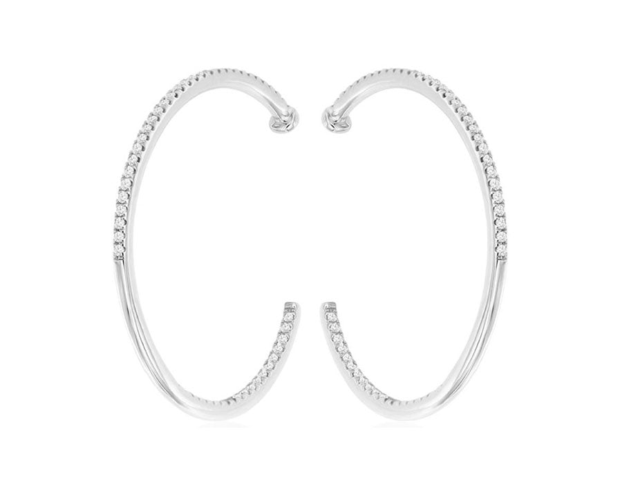 ESTATE LARGE 14KT WHITE GOLD HOOP HANGING EARRINGS. 3D INSIDE OUT DESIGN. DIAMONDS ARE F/G COLOR, VSSI CLARITY .30 CARATS. WRITTEN APPRAISAL AVAILABLE. COMES IN A PRESENTABLE GIFT BOX.