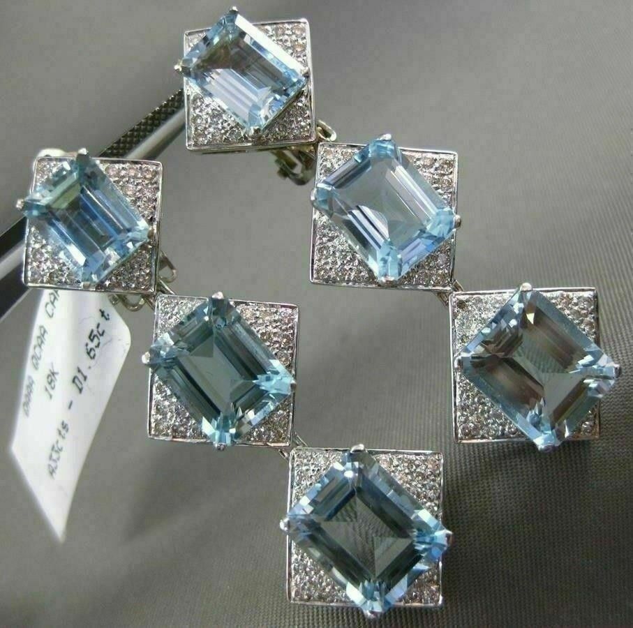ESTATE LARGE 34.65CT DIAMOND & AAA AQUAMARINE 18K WHITE GOLD 3D HANGING EARRINGS