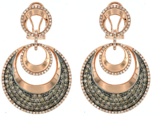 ESTATE LARGE 14KT ROSE GOLD HANGING EARRINGS. 3D SEMI MOON CIRCULAR DESIGN. DIAMONDS ARE F/G COLOR, VSSI CLARITY .80 CARATS. CHOCOLATE FANCY DIAMONDS ARE 2.15 CARATS. WRITTEN APPRAISAL AVAILABLE. COMES IN A PRESENTABLE GIFT BOX.