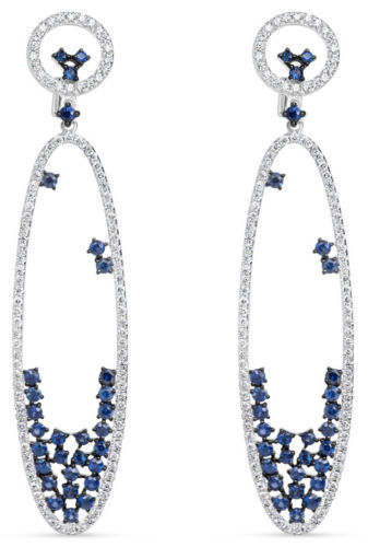 ESTATE LARGE 18KT WHITE GOLD FUN HANGING EARRINGS. 3D ROUND OVAL ETOILE DESIGN. DIAMONDS ARE F/G COLOR, VSSI CLARITY 1.90 CARATS. AAA SAPPHIRES ARE 2.85 CARATS. WRITTEN APPRAISAL AVAILABLE. COMES IN A PRESENTABLE GIFT BOX.