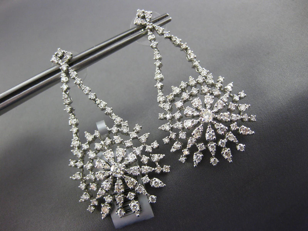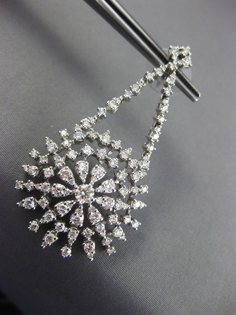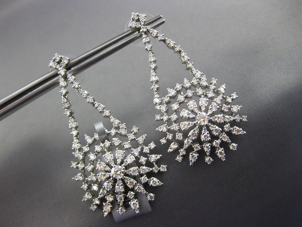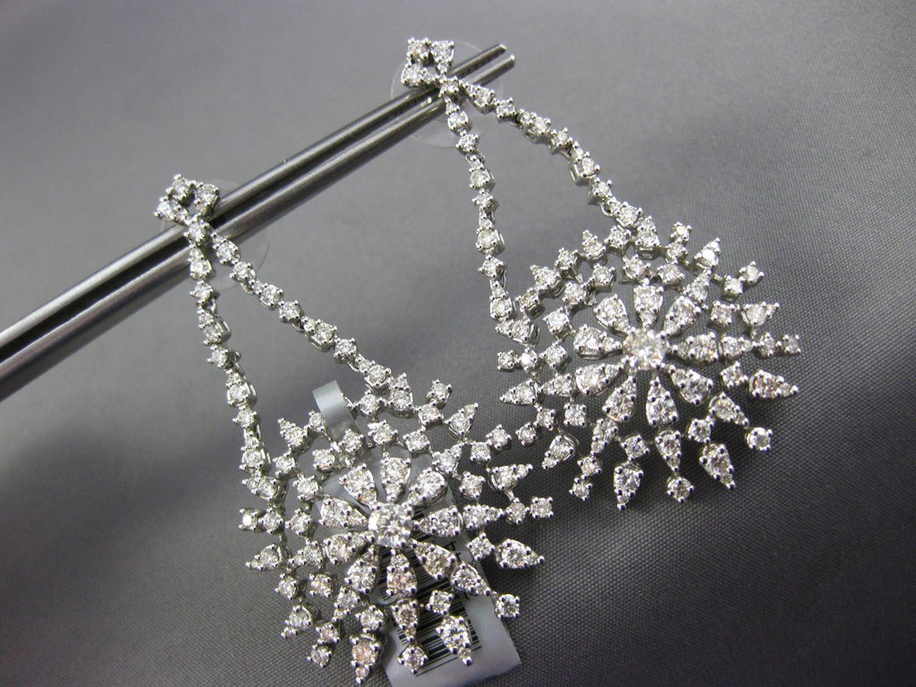 ESTATE LARGE 14KT WHITE GOLD HANGING EARRINGS. 3D FLOWER SNOWFLAKE DESIGN. DIAMONDS ARE F/G COLOR, VSSI CLARITY 4.18 CARATS. MEASURES 52mm X 26mm. WRITTEN APPRAISAL AVAILABLE. COMES IN A PRESENTABLE GIFT BOX.