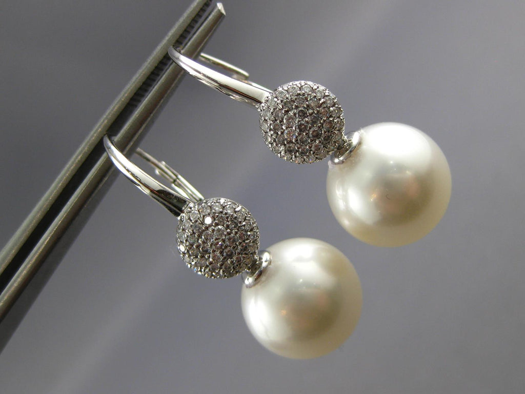 ESTATE LARGE 18KT WHITE GOLD LEVERBACK HANGING EARRINGS. 3D CLASSIC DESIGN. DIAMONDS ARE F/G COLOR, VSSI CLARITY .47 CARATS. FEATURES 12mm WIDE AAA SOUTH SEA PEARLS. EARRINGS MEASURE 30mm X 12mm. WRITTEN APPRAISAL AVAILABLE. COMES IN A PRESENTABLE GIFT BOX.