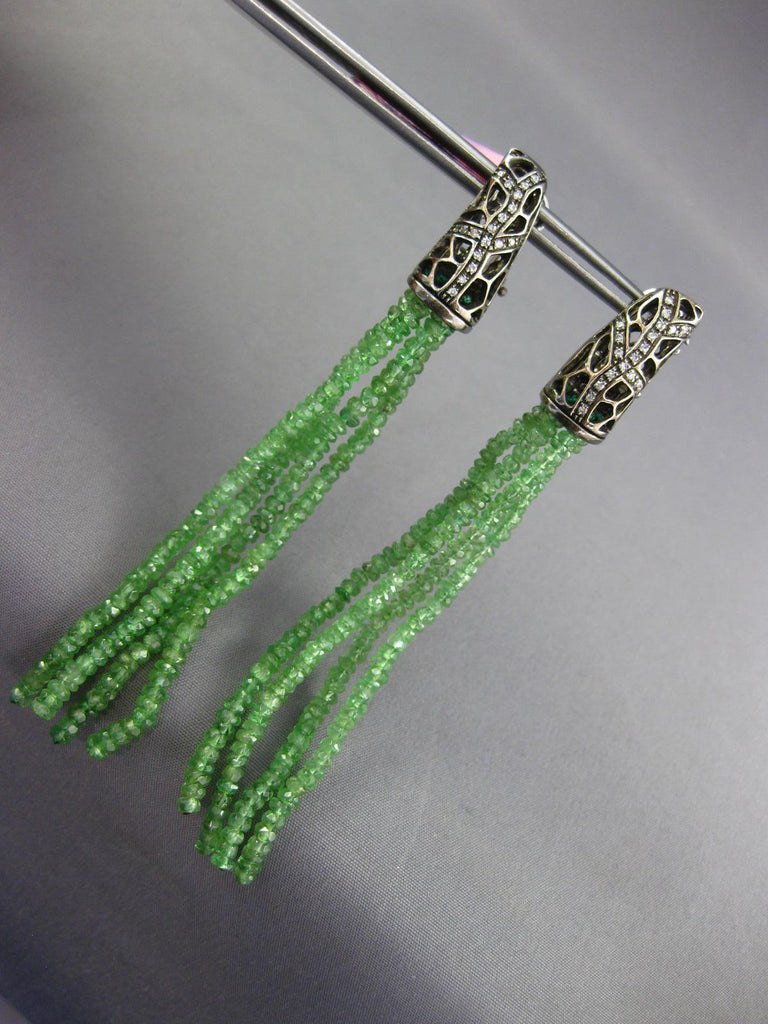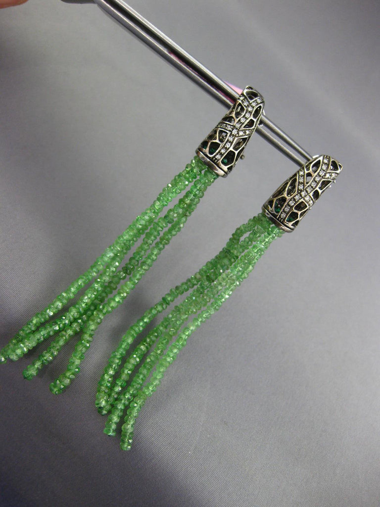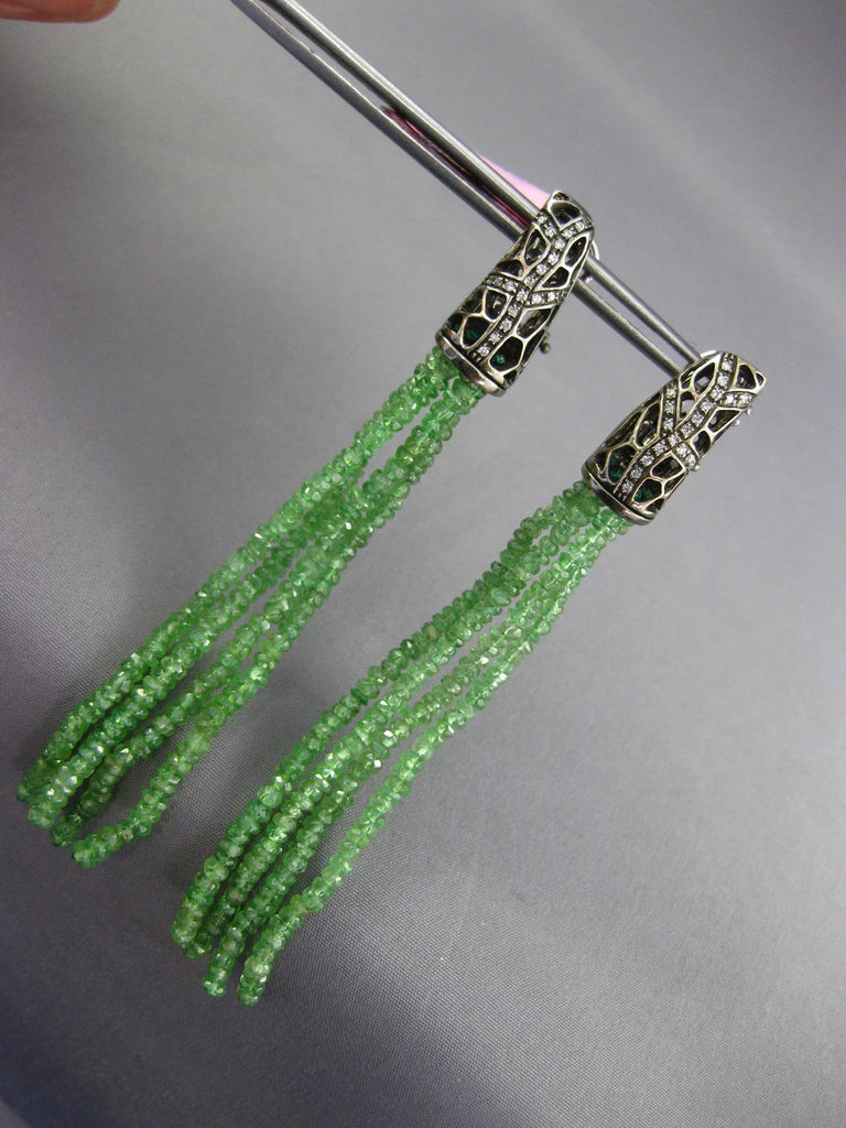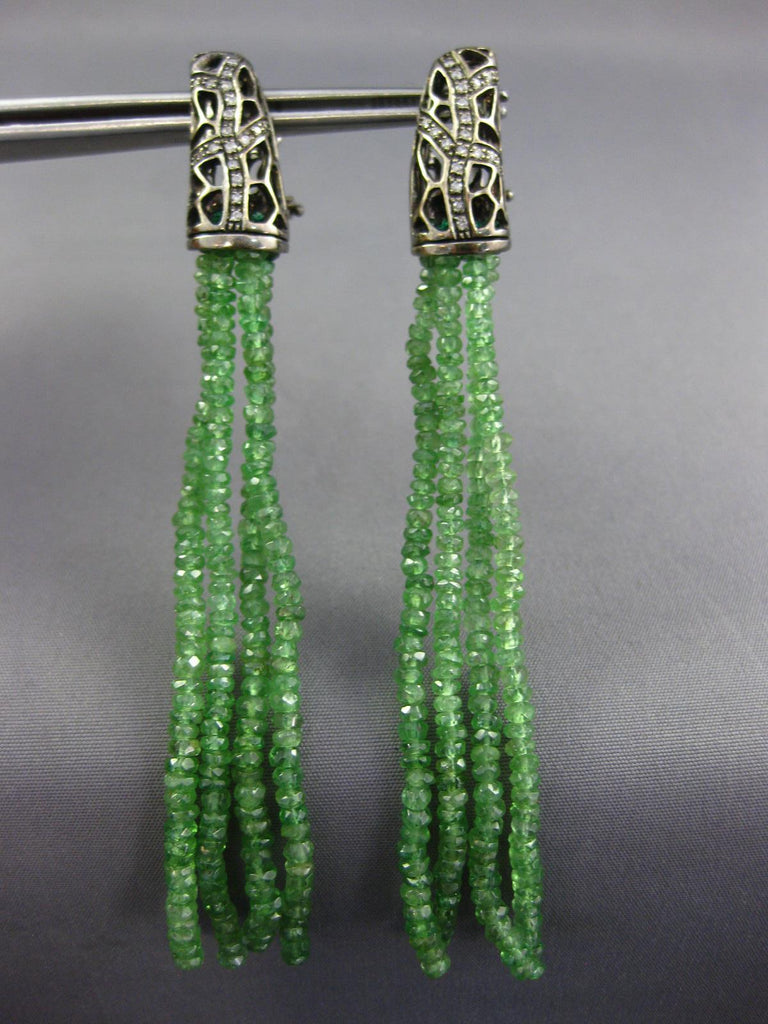 ESTATE LARGE 14KT WHITE GOLD CLIP ON HANGING EARRINGS. 3D FILIGREE MULTI STRAND CHANDELIER DESIGN. DIAMONDS ARE F/G COLOR, VSSI CLARITY .33 CARATS. AAA EMERALDS ARE 15.0 CARATS. MEASURES 87.5mm X 9mm. WRITTEN APPRAISAL AVAILABLE. COMES IN A PRESENTABLE GIFT BOX.