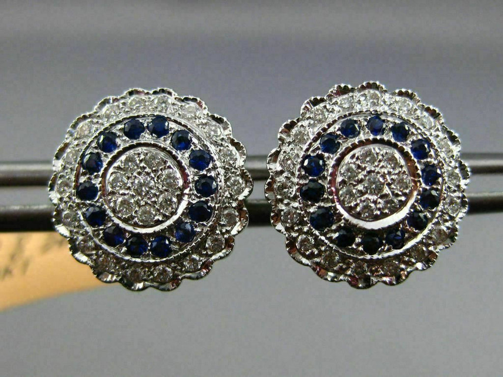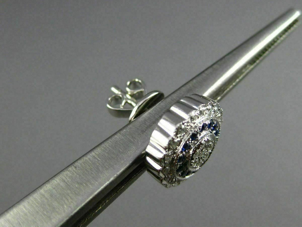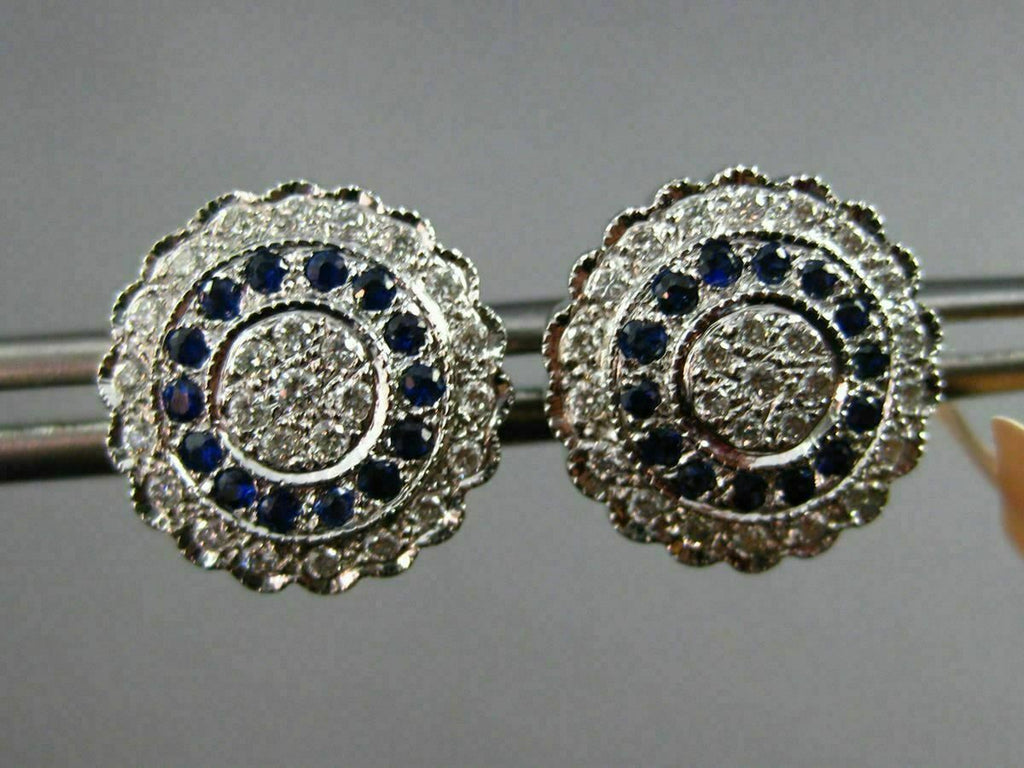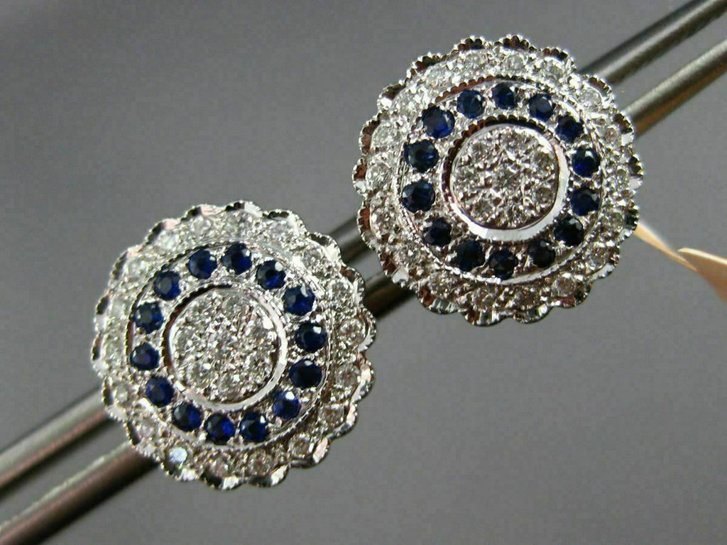 ESTATE LARGE .58CT DIAMOND SAPPHIRE 14K WHITE GOLD FLOWER MILGRAIN STUD EARRINGS