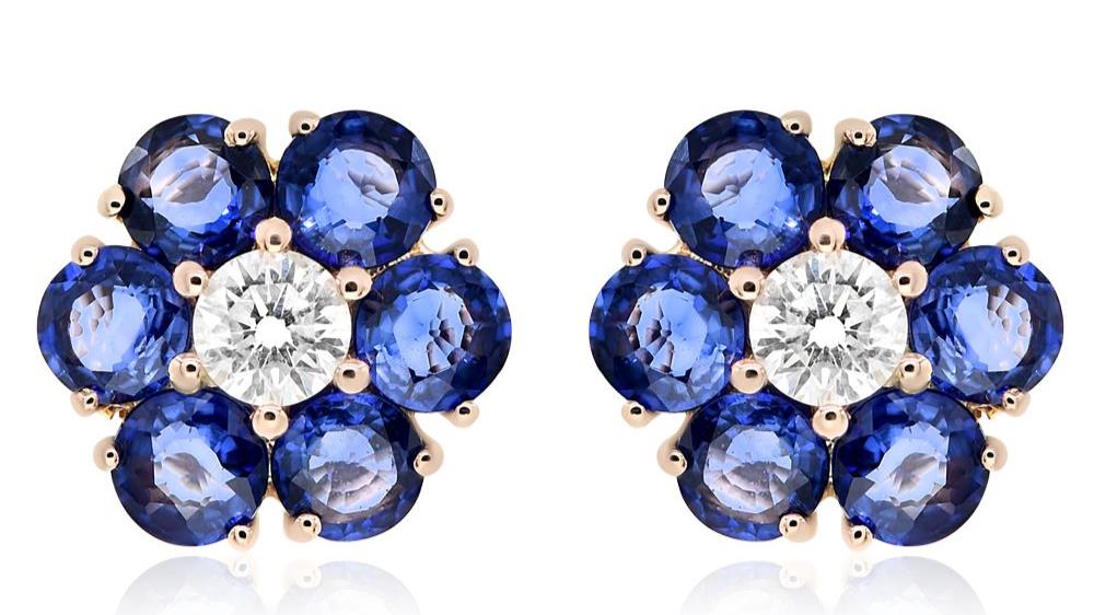 ESTATE LARGE 18KT ROSE GOLD STUD EARRINGS. 3D FLOWER DESIGN. DIAMONDS ARE F/G COLOR, VSSI CLARITY .78 CARATS. AAA SAPPHIRES ARE 5.59 CARATS. WRITTEN APPRAISAL AVAILABLE. COMES IN A PRESENTABLE GIFT BOX.