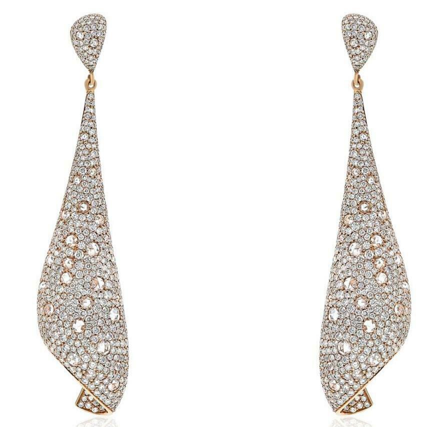ESTATELARGE 18KT ROSEGOLDHANGINGEARRINGS. 3D TEAR DROPDESIGN. DIAMONDS ARE F/G COLOR, VSSI CLARITY 8.67 CARATS. WRITTEN APPRAISAL AVAILABLE. COMES IN A PRESENTABLE GIFT BOX.