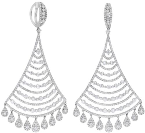 ESTATE LARGE 18KT WHITE GOLD HANGING EARRINGS. 3D MULTI ROW TRIANGULAR TEAR DROP CHANDELIER DESIGN. ROUND DIAMONDS ARE F/G COLOR, VSSI CLARITY 8.80 CARATS. WRITTEN APPRAISAL AVAILABLE. COMES IN A PRESENTABLE GIFT BOX.