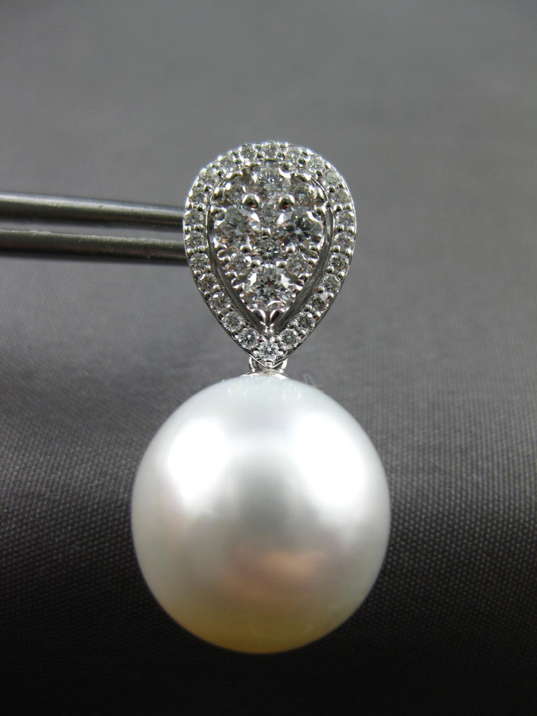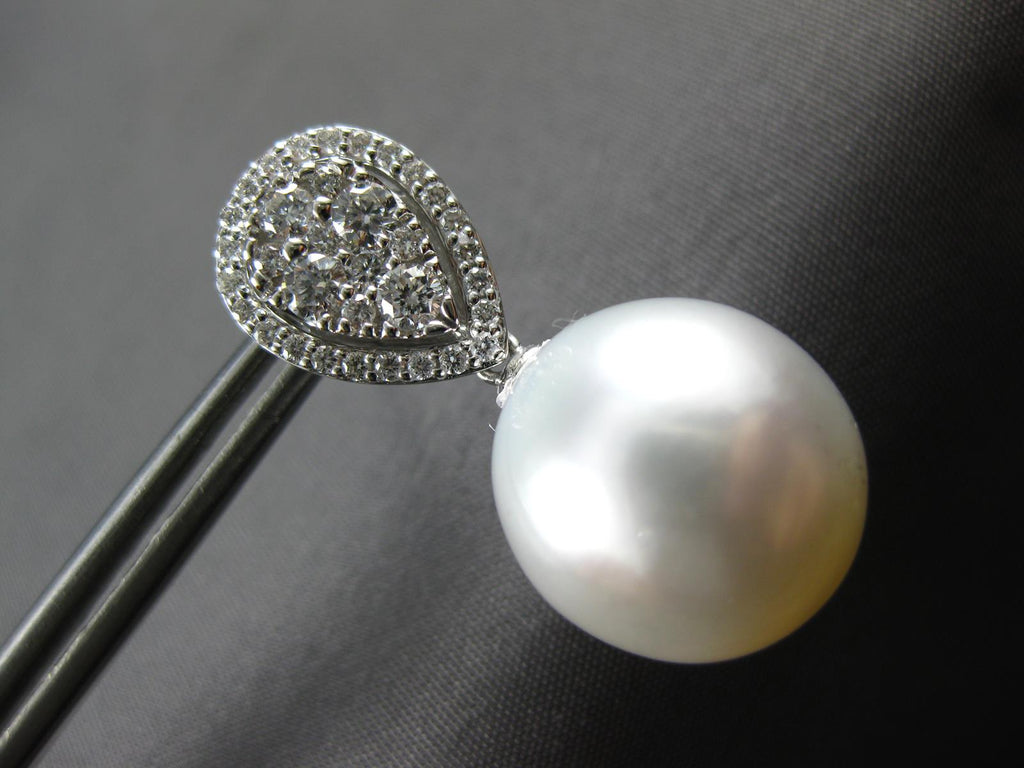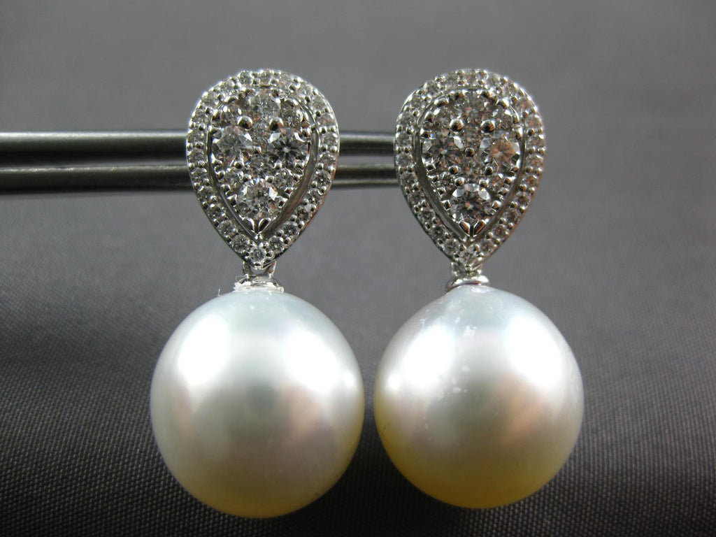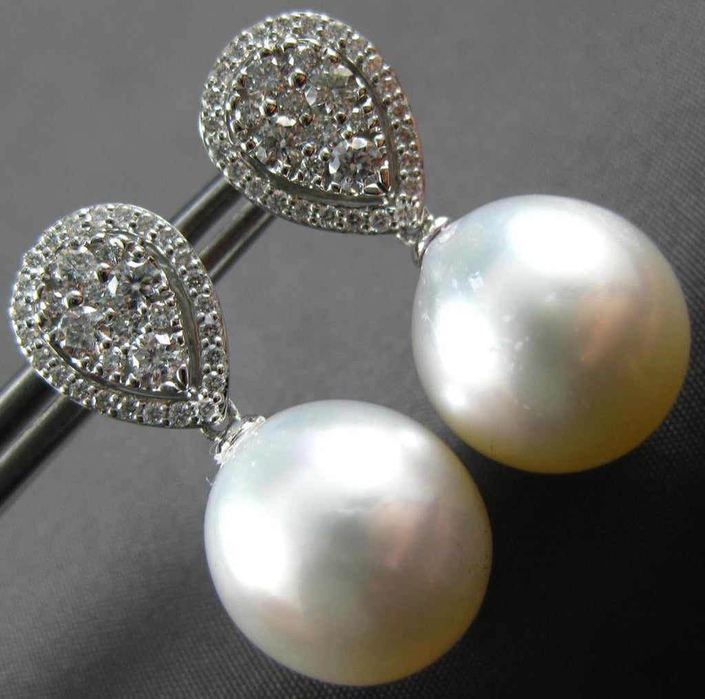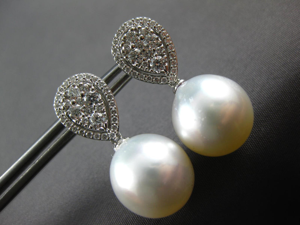 ESTATE LARGE 18KT WHITE GOLD HANGING EARRINGS. 3D CLASSIC TEAR DROP DESIGN. DIAMONDS ARE F/G COLOR, VSSI CLARITY .81 CARATS. FEATURES 13mm WIDE AAA SOUTH SEA PEARL. EARRINGS MEASURES 26mm X 13mm. WRITTEN APPRAISAL AVAILABLE. COMES IN A PRESENTABLE GIFT BOX.