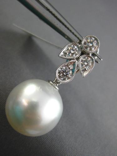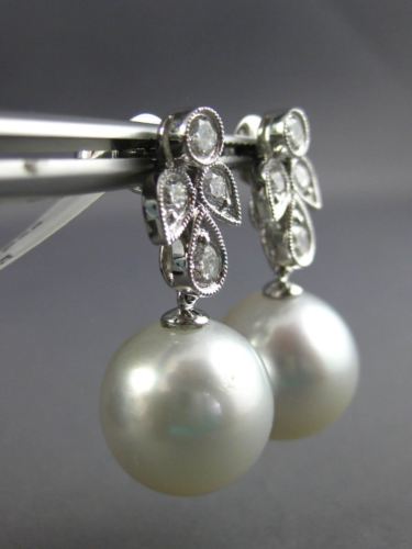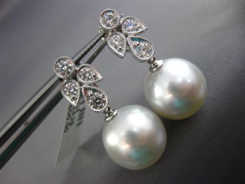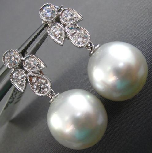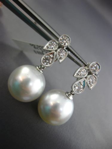 ESTATE LARGE 18KT WHITE GOLD HANGING EARRINGS. 3D FLOWER FILIGREE MILGRAIN DESIGN. DIAMONDS ARE F/G COLOR, VSSI CLARITY .85 CARATS. FEATURES AAA SOUTH SEA PEARLS 13mm WIDE. EARRINGS MEASURES 29mm X 8mm. WRITTEN APPRAISAL AVAILABLE. COMES IN A PRESENTABLE GIFT BOX.