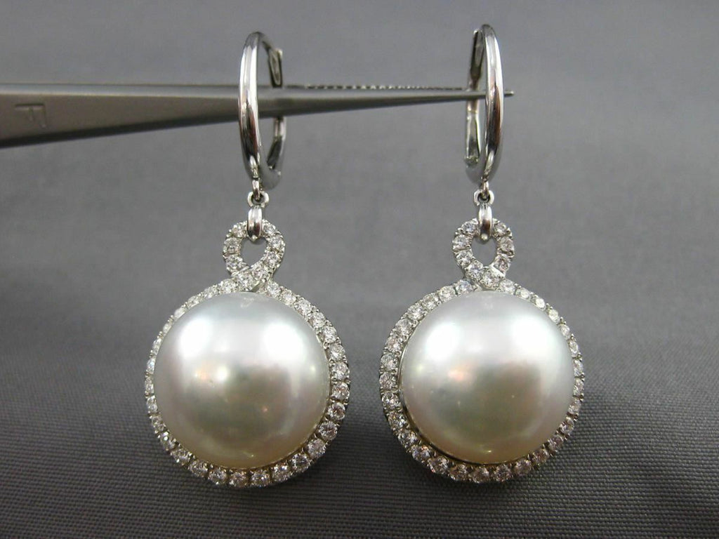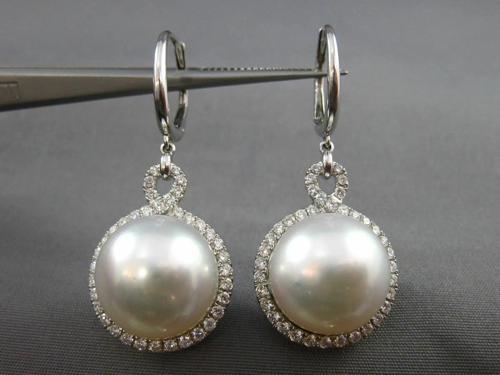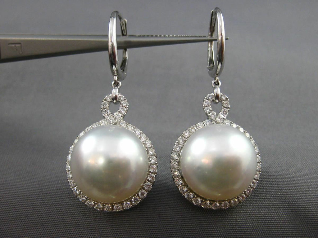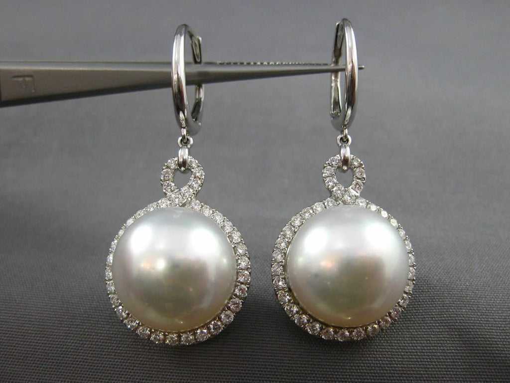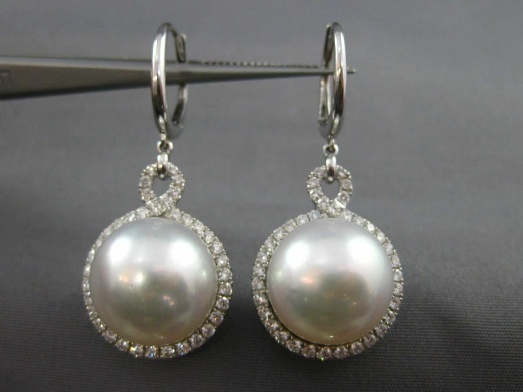 ESTATE LARGE 18KT WHITE GOLD HANGING EARRINGS. 3D JOURNEY SWIRL CLASSIC DESIGN. DIAMONDS ARE F/G COLOR, VSSI CLARITY .90 CARATS. AAA SOUTH SEA PEARLS ARE 12-13MM WIDE. WRITTEN APPRAISAL AVAILABLE. COMES IN A PRESENTABLE GIFT BOX.