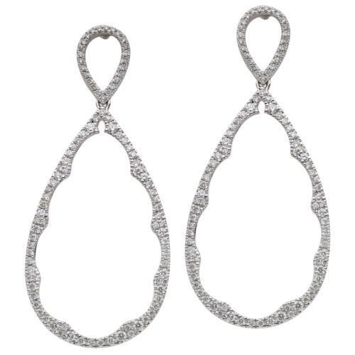 ESTATE LARGE 18KT WHITE GOLD HANGING EARRINGS. 3D OPEN FILIGREE TEAR DROP DESIGN. DIAMONDS ARE F/G COLOR, VSSI CLARITY .95 CARATS. WRITTEN APPRAISAL AVAILABLE. COMES IN A PRESENTABLE GIFT BOX.