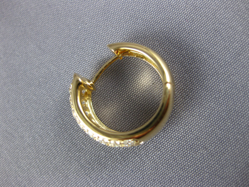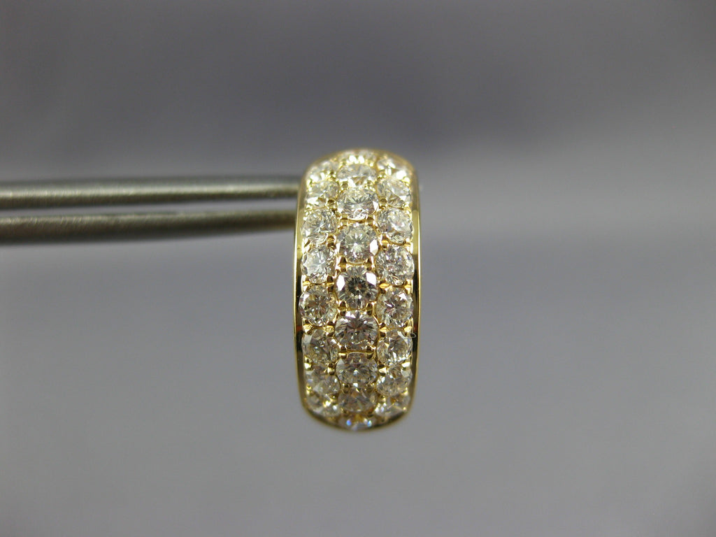 ESTATE WIDE 18KT YELLOW GOLD HUGGIE HANGING EARRINGS. 3D CLASSIC THREE ROW PAVE DESIGN. DIAMONDS ARE F/G COLOR, VSSI CLARITY 1.37 CARATS. MEASURES 6mm X 17mm. WRITTEN APPRAISAL AVAILABLE. COMES IN A PRESENTABLE GIFT BOX.