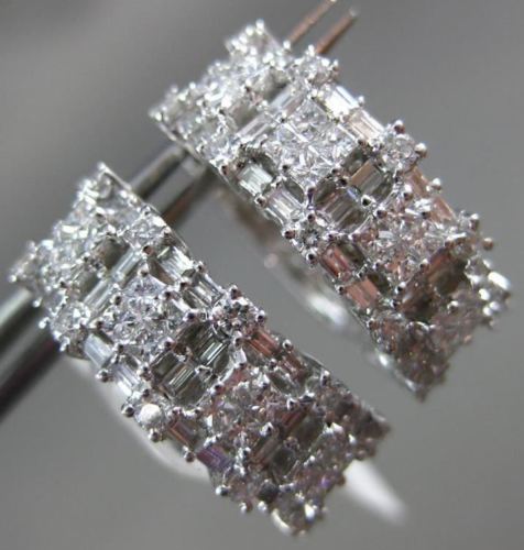 ESTATE WIDE 18KT WHITE  GOLD HUGGIE HANGING EARRINGS. 3D MULTI SHAPE DESIGN. ROUND AND PRINCESS CUT DIAMONDS ARE F/G COLOR, VSSI CLARITY, 3.90 CARATS. MEASURES 17mm X 6mm. WRITTEN APPRAISAL AVAILABLE. COMES IN A PRESENTABLE GIFT BOX.