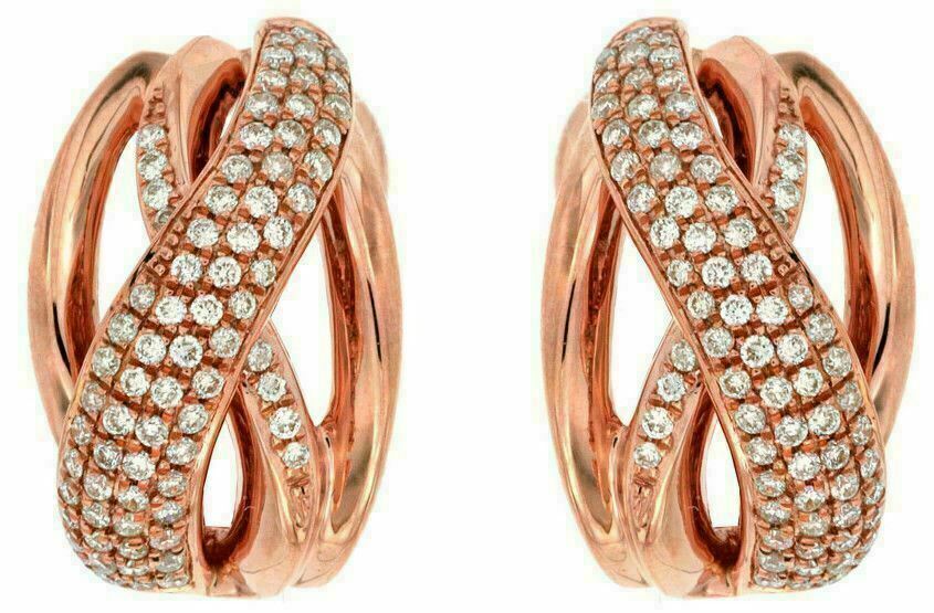 ESTATE WIDE 14KT ROSE GOLD EARRINGS. 3D MULTI ROW CRISS CROSS X LOVEDESIGN. ROUND DIAMONDS ARE F/G COLOR, VSSI CLARITY .58 CARATS. WRITTEN APPRAISAL AVAILABLE. COMES IN A PRESENTABLE GIFT BOX.