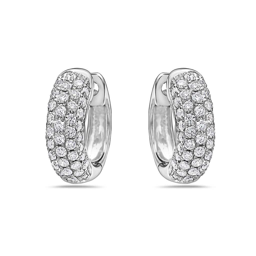 ESTATE WIDE 18KT WHITE GOLD HUGGIE HOOP EARRINGS. 3D CLASSIC FIVE ROW DESIGN. DIAMONDS ARE F/G COLOR, VSSI CLARITY .77 CARATS. WRITTEN APPRAISAL AVAILABLE. COMES IN A PRESENTABLE GIFT BOX.