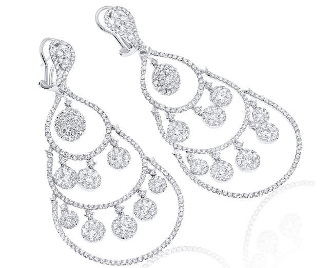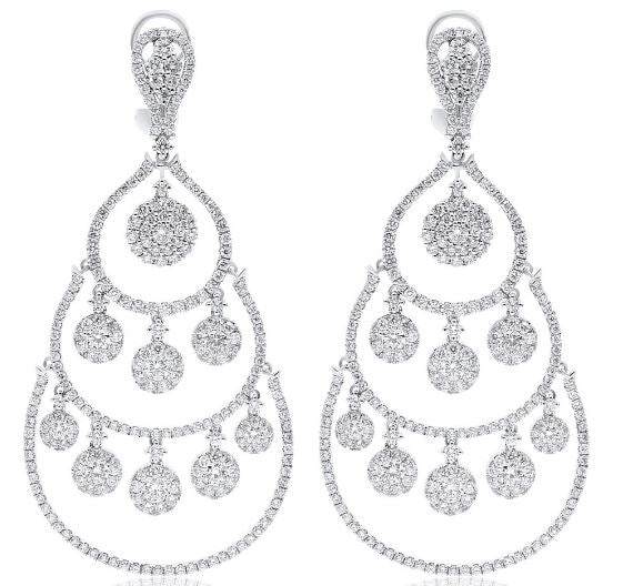 EXTRA LARGE 18KT WHITEGOLD HANGINGEARRINGS. 3D MULTI FLOWER TEAR DROP CHANDELIERDESIGN. DIAMONDS ARE F/G COLOR, VSSI CLARITY 11.24CARATS. WRITTEN APPRAISAL AVAILABLE. COMES IN A PRESENTABLE GIFT BOX.