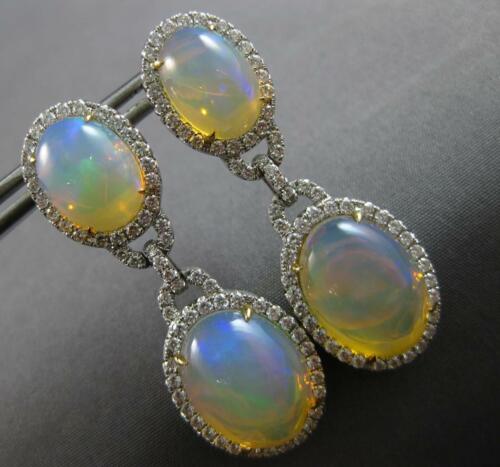 EXTRA LARGE 14KT WHITE GOLD HANGING EARRINGS. 3D CLASSIC HALO FILIGREE DESIGN. ROUND DIAMONDS ARE F/G COLOR, VSSI CLARITY 1.68 CARATS. AAA OVAL AUSTRALIAN OPALS ARE 14.19 CARATS. AUSTRALIAN OPALS RANGE FROM 12mm X 8.5mm TO 16mm X 11.5mm. EARRINGS MEASURE 43mm X 15mm. WRITTEN APPRAISAL AVAILABLE. COMES IN A PRESENTABLE GIFT BOX.