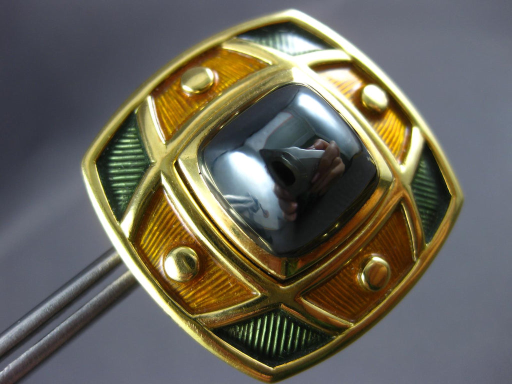 EXTRA LARGE 18KT YELLOW GOLD DE VROOMEN CLIP ON EARRINGS. 3D SQUARE DESIGN. FEATURES MULTI COLOR ENAMEL. MEASURES 30mm WIDE. WRITTEN APPRAISAL AVAILABLE. COMES IN A PRESENTABLE GIFT BOX.