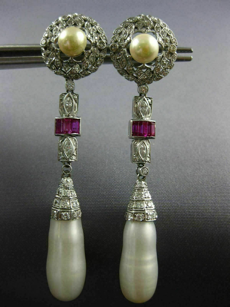 EXTRA LARGE 14KT WHITE GOLD HANGING EARRINGS. 3D FLOWER DESIGN. DIAMONDS ARE F/G COLOR, VSSI CLARITY 1.98 CARATS. AAA RUBIES ARE .60 CARATS. FEATURES AAA SOUTH SEA PEARLS. MEASURES 64mm X 15mm. WRITTEN APPRAISAL AVAILABLE. COMES IN A PRESENTABLE GIFT BOX.
