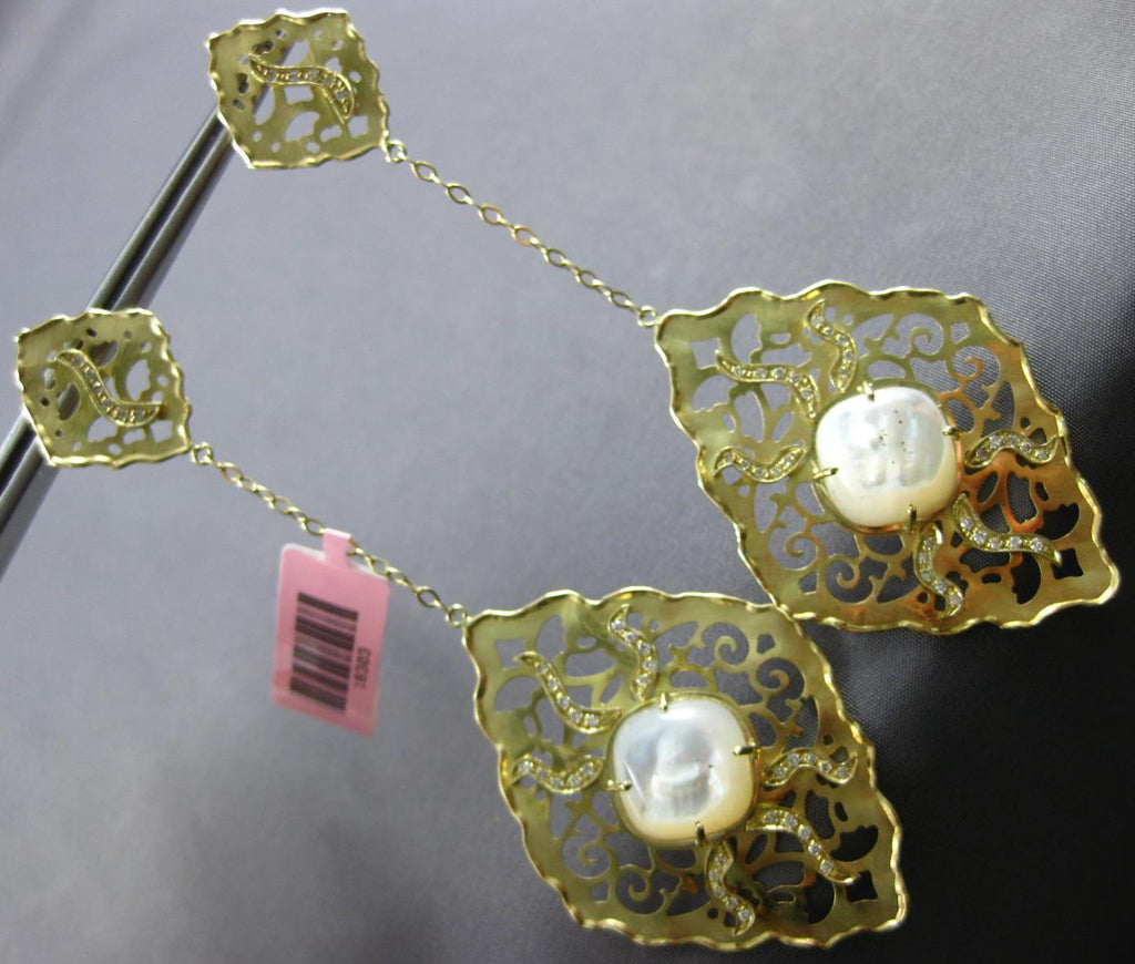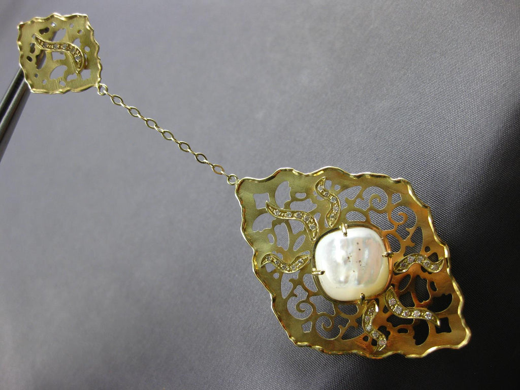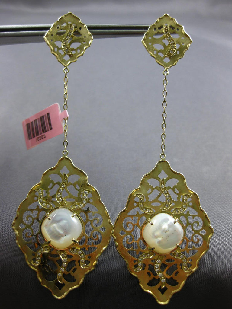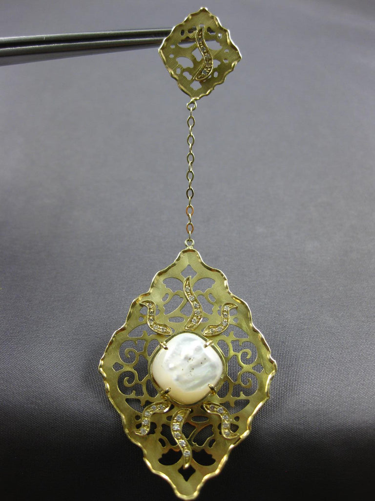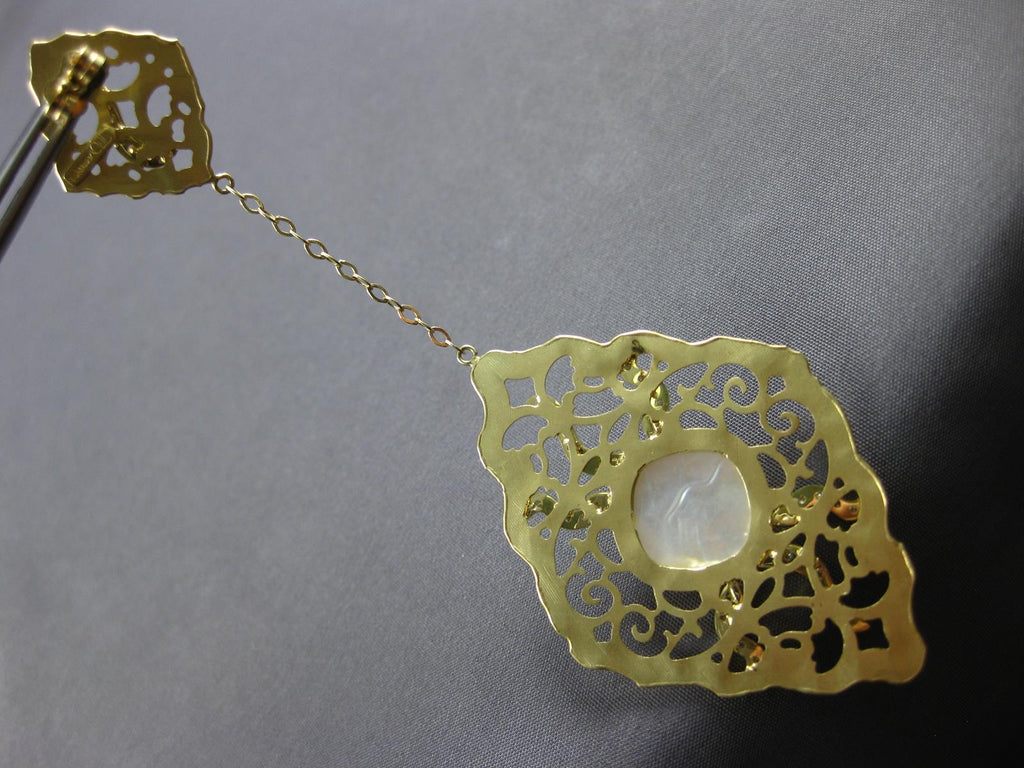 EXTRA LARGE 14KT YELLOW GOLD HANGING EARRINGS. 3D OPEN FILIGREE FLOWER DESIGN. DIAMONDS ARE F/G COLOR, VSSI CLARITY .76 CARATS. AAA MOONSTONE ARE 20.0 CARATS. MEASURES 98mm X 35mm. WRITTEN APPRAISAL AVAILABLE. COMES IN A PRESENTABLE GIFT BOX.