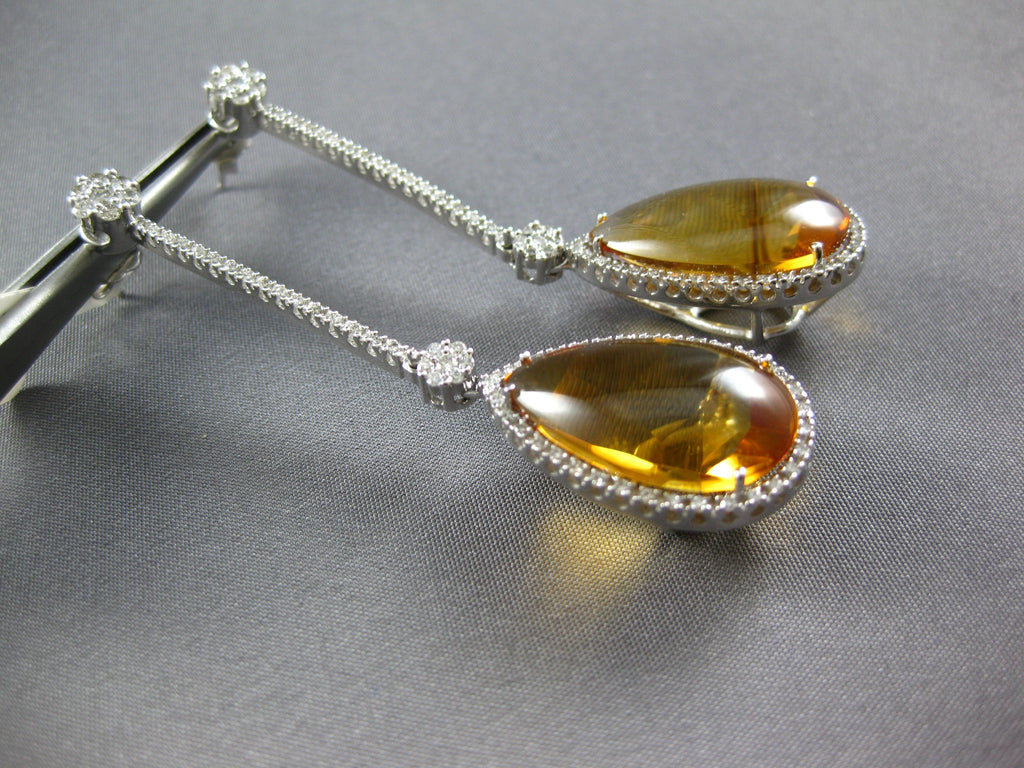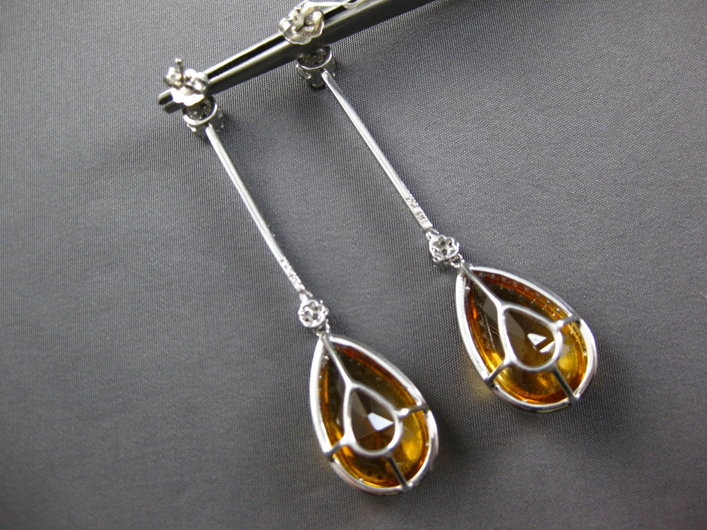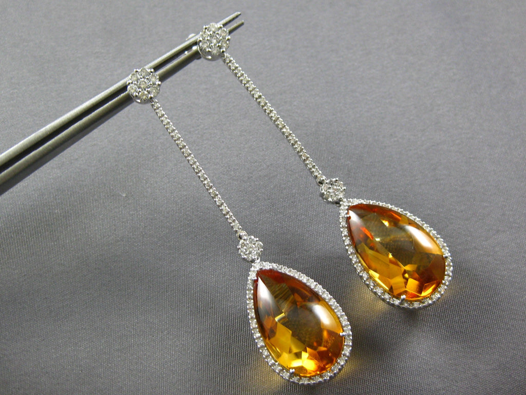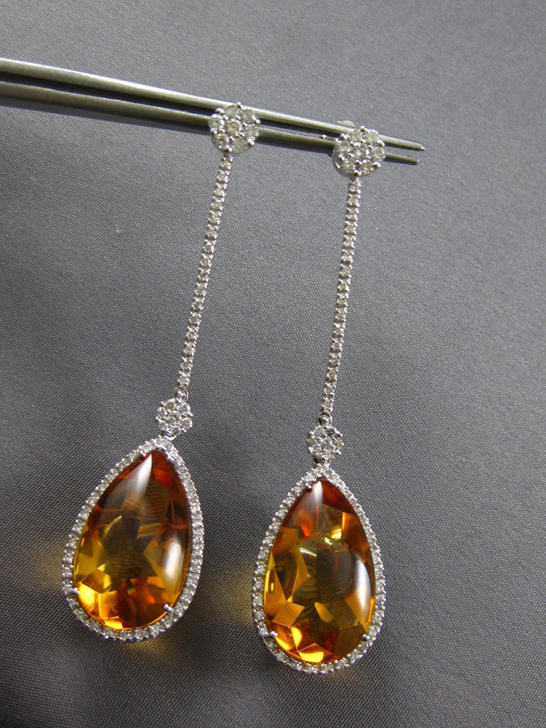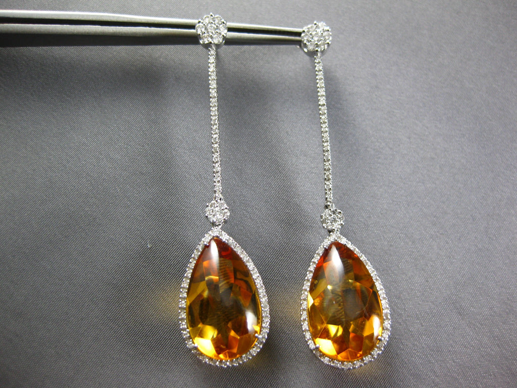 EXTRA LARGE 14KT WHITE GOLD HANGING EARRINGS. 3D TEAR DROP FLOWER DESIGN. ROUND DIAMONDS ARE F/G COLOR, VSSI CLARITY 1.0 CARAT. AAA PEAR SHAPE CITRINES ARE 23.75 CARATS. MEASURES 61mm X 14mm. WRITTEN APPRAISAL AVAILABLE. COMES IN A PRESENTABLE GIFT BOX.