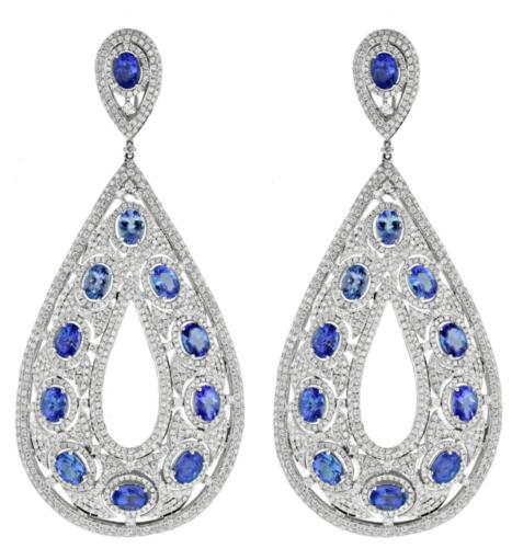 EXTRA LARGE 18KT WHITE GOLD HANGING EARRINGS. 3D TEAR DROP DESIGN. ROUND DIAMONDS ARE G/H COLOR, VSSI CLARITY 14.8 CARATS. AAA OVAL TANZANITES ARE 14.3 CARATS.