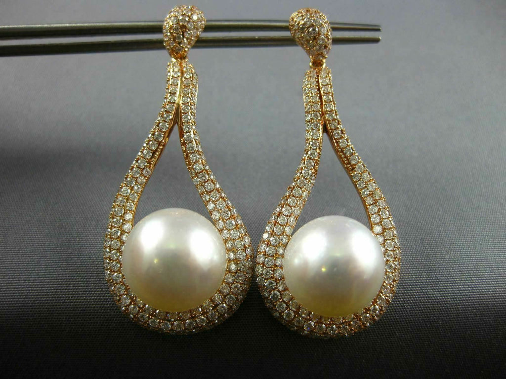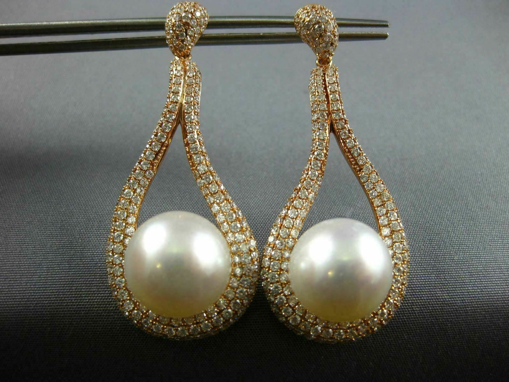 EXTRA LARGE 18KT ROSE GOLD HANGING EARRINGS. 3D MULTI ROW TEAR DROPDESIGN. DIAMONDS ARE F/G COLOR, VSSI CLARITY 3.45 CARATS. FEATURES AAA SOUTH SEA PEARLS.MEASURES 47mm X 20mm. WRITTEN APPRAISAL AVAILABLE. COMES IN A PRESENTABLE GIFT BOX.