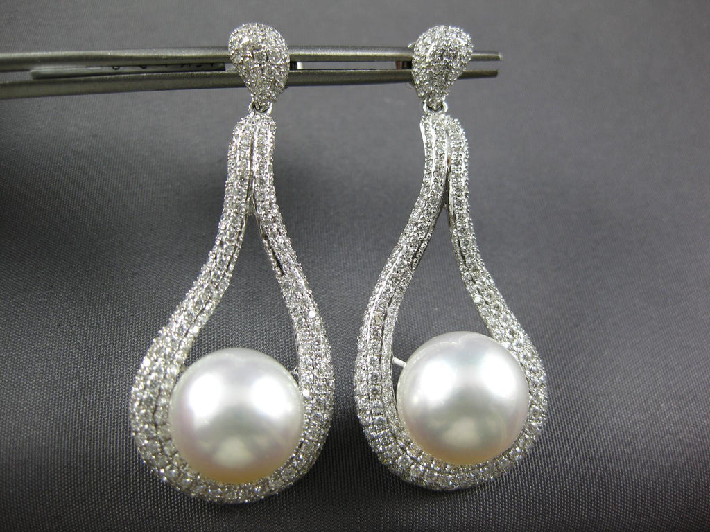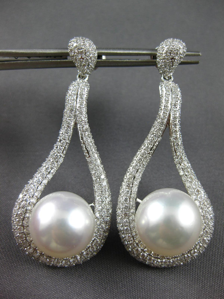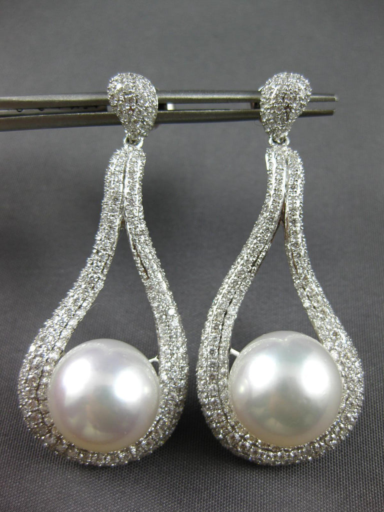 EXTRA LARGE 18KT WHITE GOLD HANGING EARRINGS. 3D TEAR DROP MULTI ROW DESIGN. DIAMONDS ARE F/G COLOR, VSSI CLARITY 3.45 CARATS. FEATURES AAA SOUTH SEA PEARLS. MEASURES 46mm X 19mm. WRITTEN APPRAISAL AVAILABLE. COMES IN A PRESENTABLE GIFT BOX.