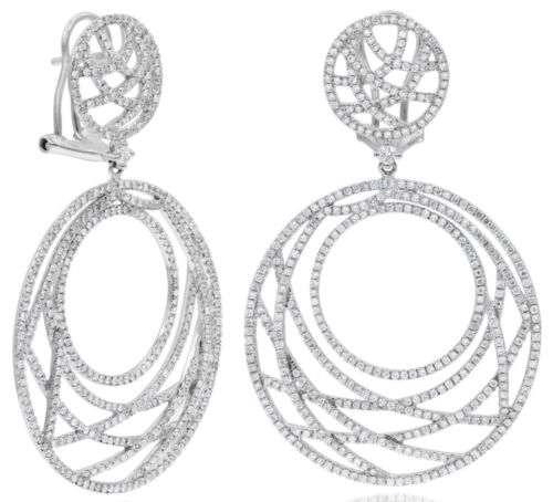 EXTRA LARGE 18KT WHITE GOLD HANGING EARRINGS. 3D DOUBLE CIRCULAR CRISS CROSS FUN CLIP ON DESIGN. ROUND DIAMONDS ARE F/G COLOR, VSSI CLARITY 3.65 CARATS. WRITTEN APPRAISAL AVAILABLE. COMES IN A PRESENTABLE GIFT BOX.