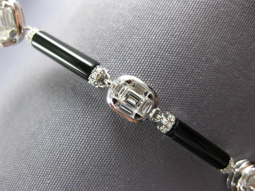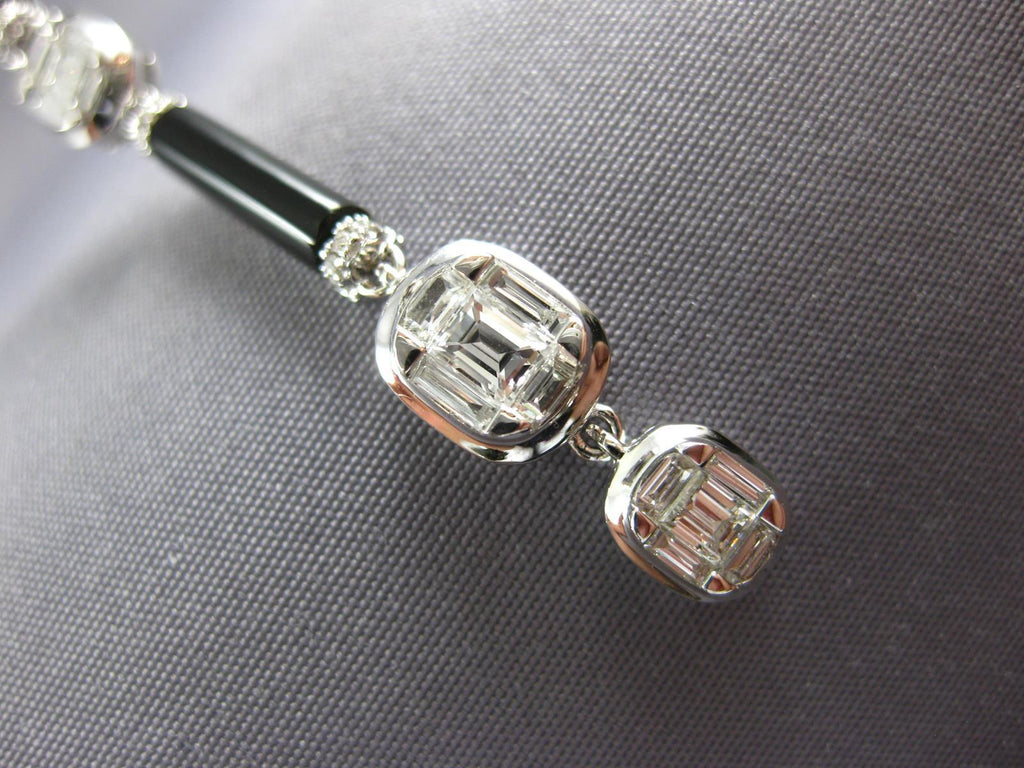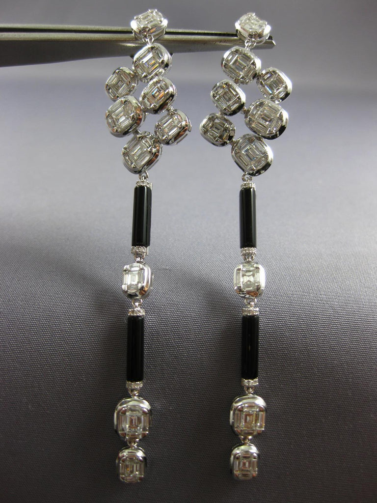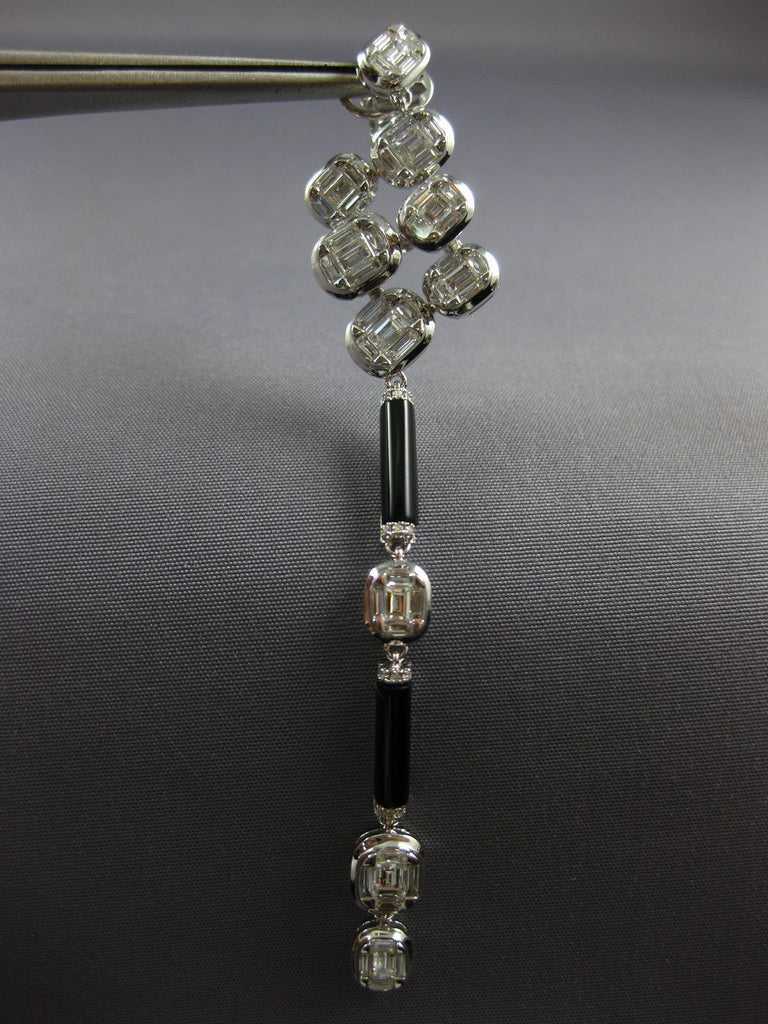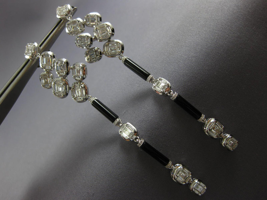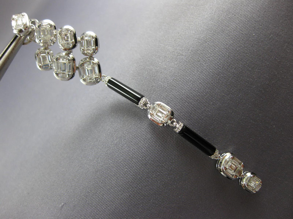 EXTRA LARGE 18KT WHITE GOLD FUN HANGING EARRINGS. 3D INVISIBLE OVAL DESIGN. DIAMONDS ARE F/G COLOR, VS CLARITY. ROUND DIAMONDS ARE .12 CARATS. BAGUETTE DIAMONDS ARE 3.70 CARATS. FEATURES BLACK ENAMEL. MEASURES 86mm X 16mm. WRITTEN APPRAISAL AVAILABLE. COMES IN A PRESENTABLE GIFT BOX.
