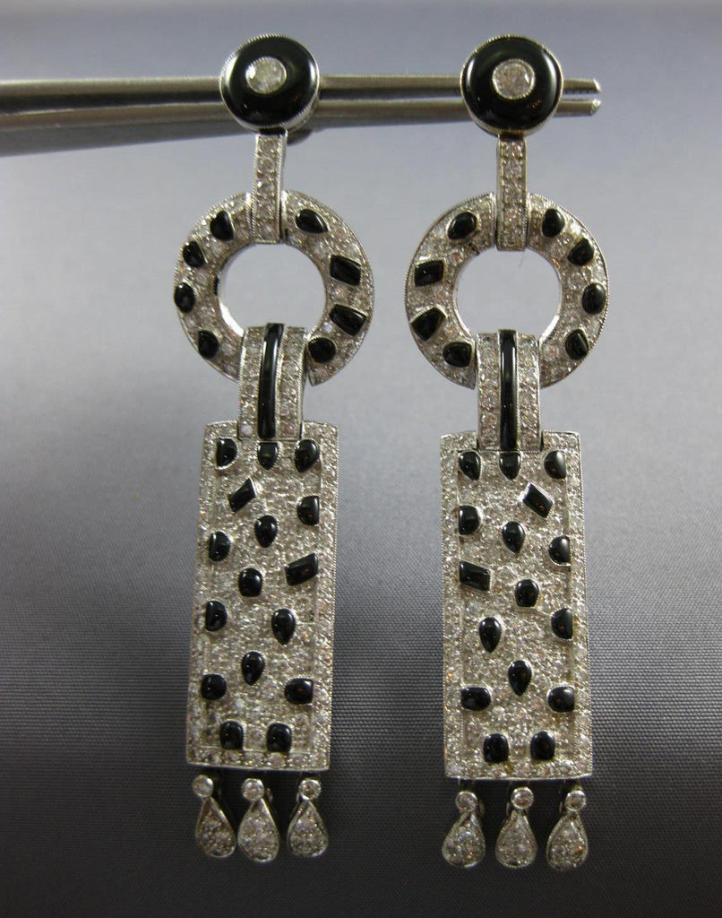 EXTRA LARGE18KT WHITE GOLD HANGING EARRINGS. 3D CHANDELIER DESIGN. DIAMONDS ARE F/G COLOR, VSSI CLARITY 4.5 CARATS. FEATURES AAA BLACK ENAMEL.MEASURES 78mm X 19mm. WRITTEN APPRAISAL AVAILABLE. COMES IN A PRESENTABLE GIFT BOX.