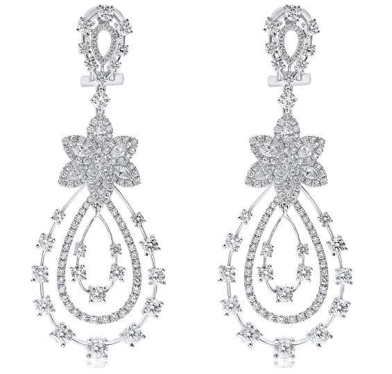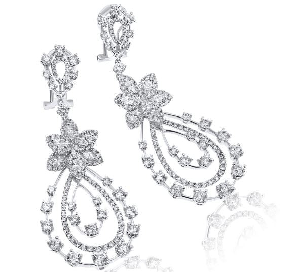 EXTRA LARGE 18KT WHITEGOLD FUNHANGINGEARRINGS. 3D FLOWER TEAR DROPDESIGN. DIAMONDS ARE F/G COLOR, VSSI CLARITY 5.99CARATS. WRITTEN APPRAISAL AVAILABLE. COMES IN A PRESENTABLE GIFT BOX.
