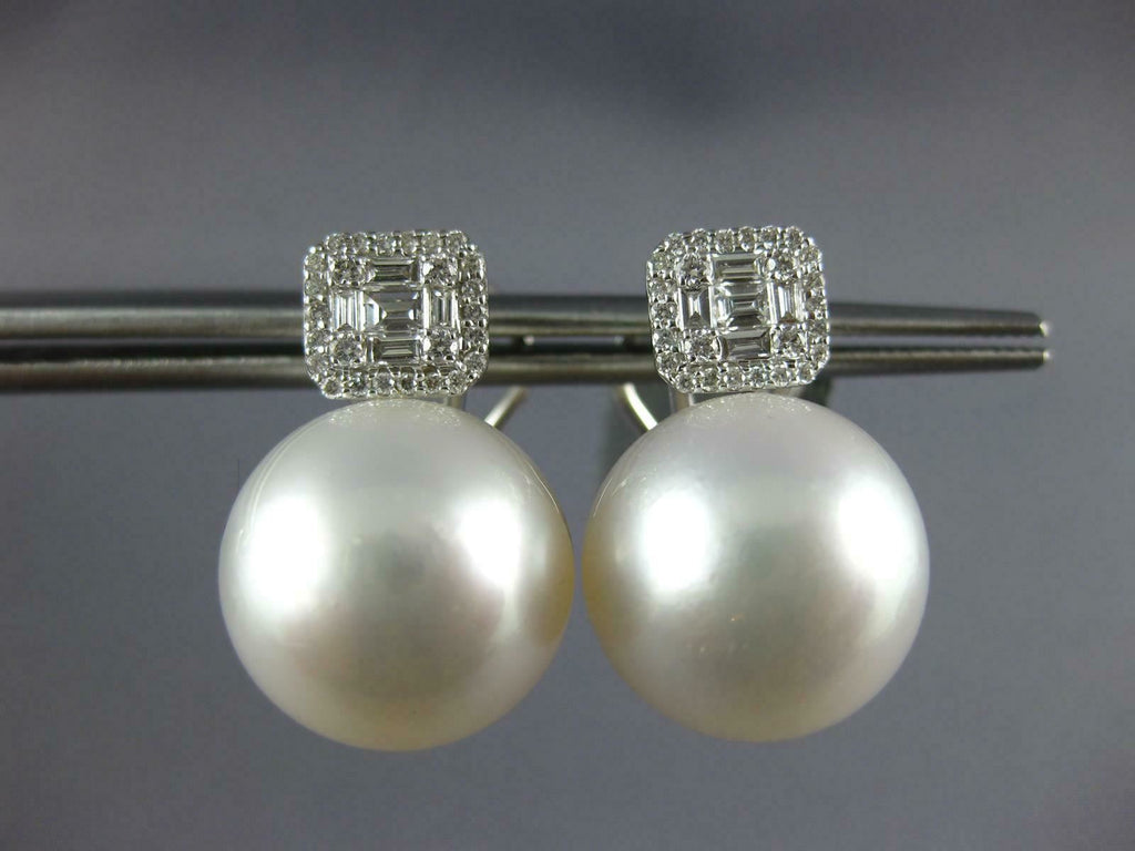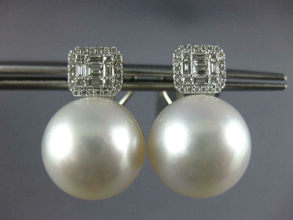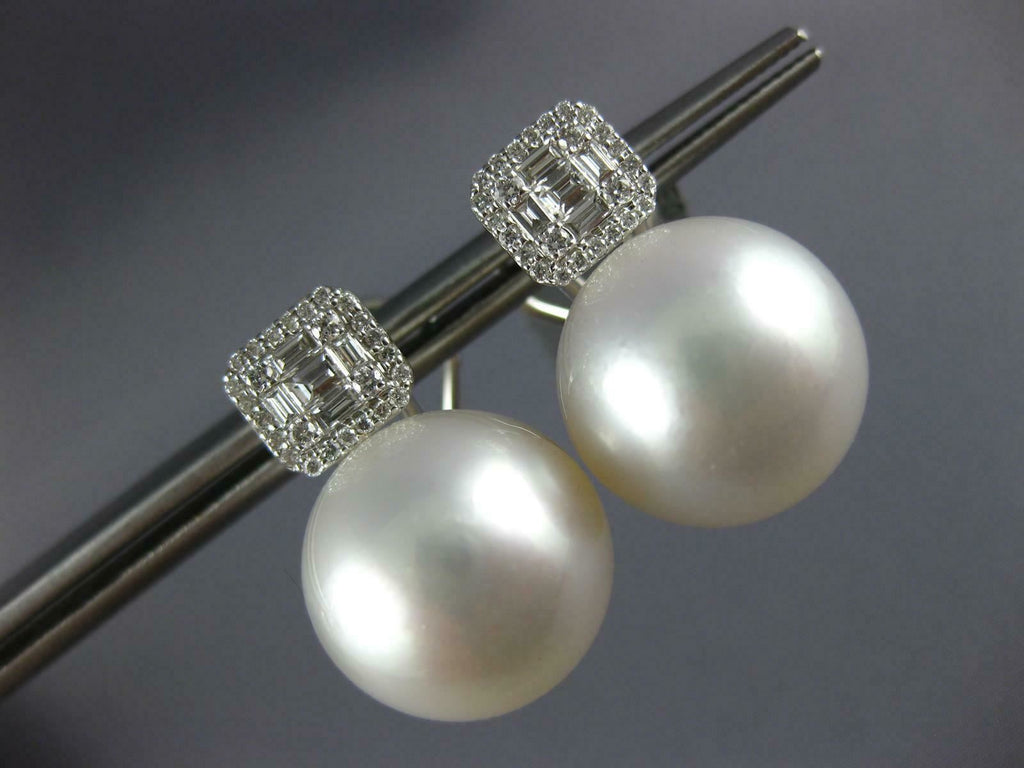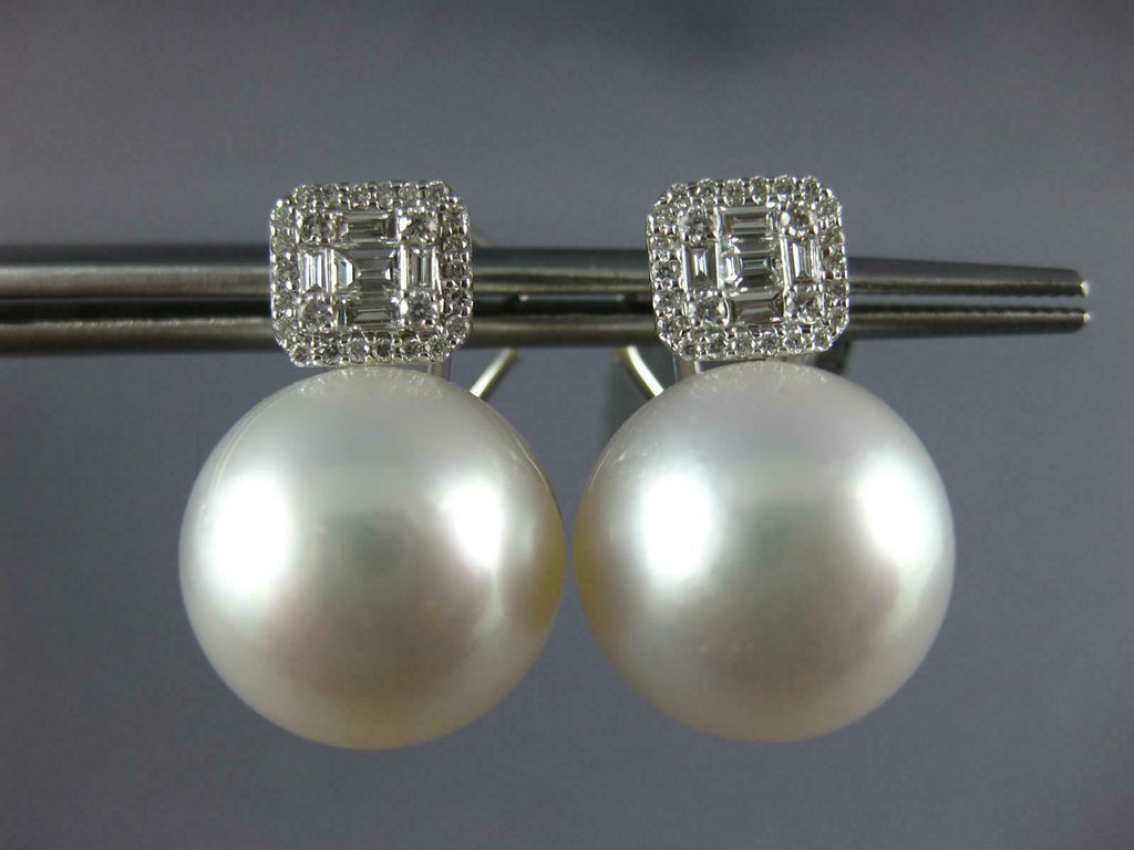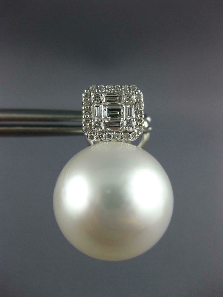 EXTRA LARGE18KT WHITEGOLD CLIP ON EARRINGS. 3D CLASSIC DESIGN. ROUND AND BAGUETTEDIAMONDS ARE F/G COLOR, VSSI CLARITY .60 CARATS. FEATURES AAA SOUTH SEA PEARL.MEASURES 22mm X 15mm. WRITTEN APPRAISAL AVAILABLE. COMES IN A PRESENTABLE GIFT BOX.