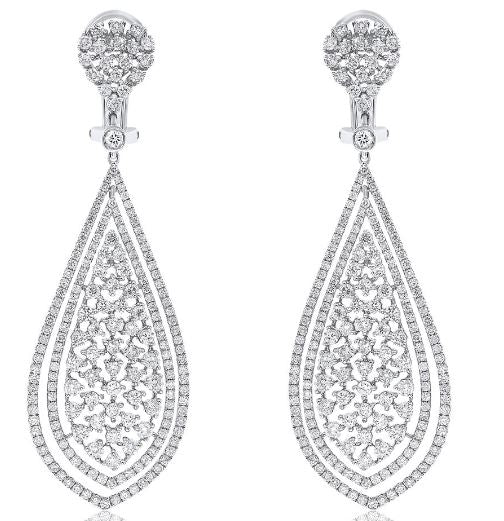 EXTRA LARGE 18KT WHITEGOLD FUNHANGINGEARRINGS. 3D OPEN FILIGREE DOUBLE TEAR DROPDESIGN. DIAMONDS ARE F/G COLOR, VSSI CLARITY 7.39CARATS. WRITTEN APPRAISAL AVAILABLE. COMES IN A PRESENTABLE GIFT BOX.