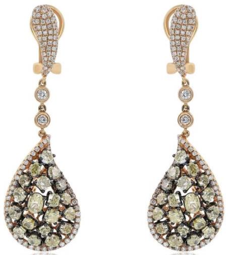 EXTRA LARGE18KT ROSEGOLD CLIP ONHANGINGEARRINGS. 3D CLUSTER TEAR DROPDESIGN. WHITE DIAMONDS ARE F/G COLOR, VSSI CLARITY 1.81 CARATS. MULTI COLOR DIAMONDS ARE 5.76 CARATS.WRITTEN APPRAISAL AVAILABLE. COMES IN A PRESENTABLE GIFT BOX.