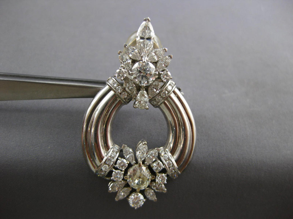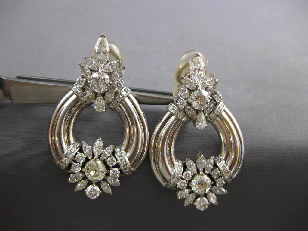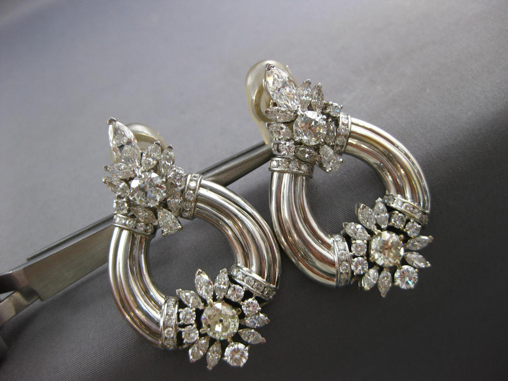 EXTRA LARGE 14KT WHITE GOLD CLIP ON HANGING EARRINGS. 3D TEAR DROP DESIGN. ROUND AND MARQUISE DIAMONDS ARE F/G COLOR, VSSI CLARITY 7.60 CARATS. MEASURES 51mm X 32mm. WRITTEN APPRAISAL AVAILABLE. COMES IN A PRESENTABLE GIFT BOX.