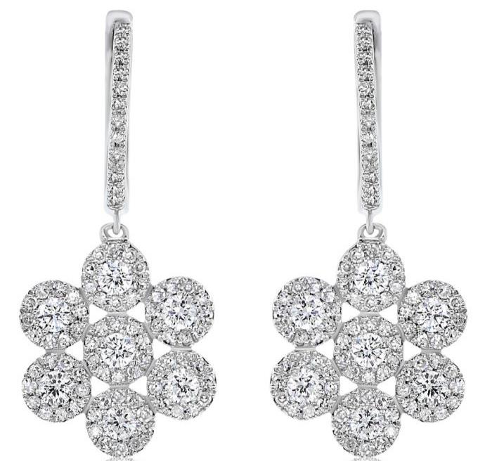 LARGE 14KT WHITEGOLD LEVERBACKHANGINGEARRINGS. 3D MULTI FLOWERDESIGN. DIAMONDS ARE F/G COLOR, VSSI CLARITY 1.05 CARATS. WRITTEN APPRAISAL AVAILABLE. COMES IN A PRESENTABLE GIFT BOX.