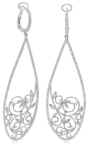 LARGE 1.11CT DIAMOND 14KT WHITE GOLD 3D OPEN FILIGREE TEAR DROP HANGING EARRINGS