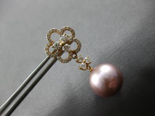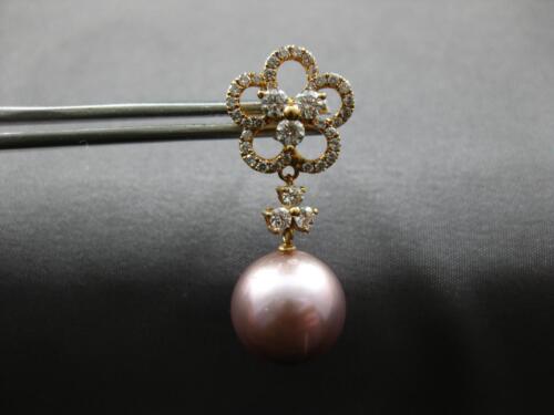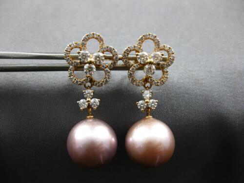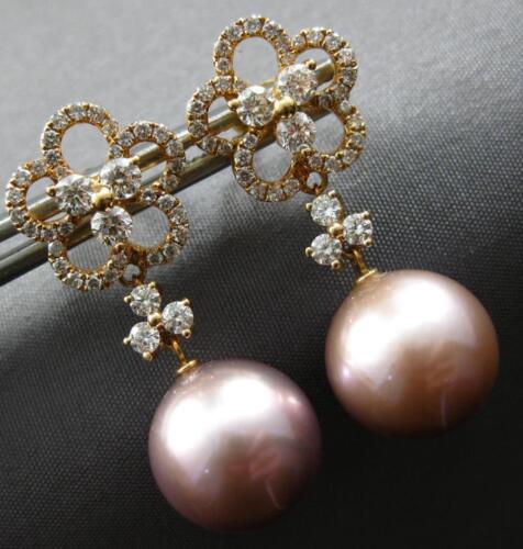 LARGE 18KT ROSE GOLD FUN HANGING EARRINGS. 3D FLOWER DESIGN. DIAMONDS ARE F/G COLOR, VSSI CLARITY. SMALL DIAMONDS ARE .64 CARATS. LARGE DIAMONDS ARE .47 CARATS. FEATURES AAA PINK SOUTH SEA PEARL. MEASURES 32mm X 12mm. WRITTEN APPRAISAL AVAILABLE. COMES IN A PRESENTABLE GIFT BOX.