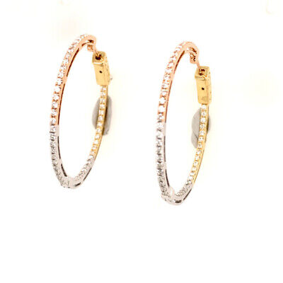 LARGE 18KT WHITE YELLOW AND ROSE GOLD HOOP HANGING EARRINGS. 3D INSIDE OUT DESIGN. DIAMONDS ARE F/G COLOR, VSSI CLARITY 1.25 CARATS. WRITTEN APPRAISAL AVAILABLE. COMES IN A PRESENTABLE GIFT BOX.