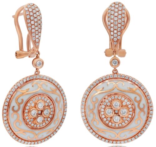 LARGE 18KT ROSE GOLD CLIP ON HANGING EARRINGS. 3D FLORAL CIRCULAR DESIGN. ROUND DIAMONDS ARE F/G COLOR, VSSI CLARITY 1.29 CARATS. FEATURES WHITE ENAMELS. WRITTEN APPRAISAL AVAILABLE. COMES IN A PRESENTABLE GIFT BOX.