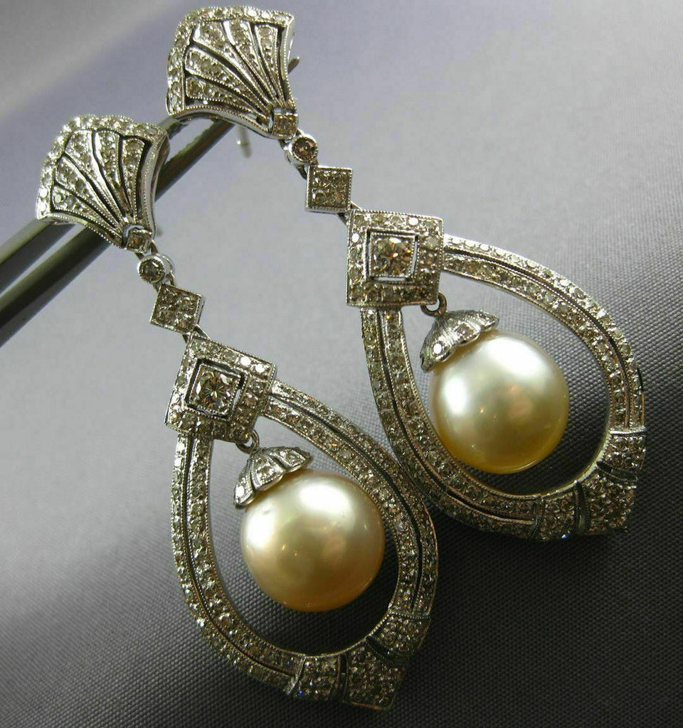 LARGE 18KT WHITE  GOLD HANGING EARRINGS. 3D TEAR DROP FILIGREE DESIGN. DIAMONDS ARE G/H COLOR, VSSI CLARITY 1.30 CARATS. FEATURES AAA SOUTH SEA PEARLS. MEASURES 53mm X 20mm. WRITTEN APPRAISAL AVAILABLE. COMES IN A PRESENTABLE GIFT BOX.